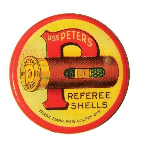 Celluloid Pinback advertising Peters Referee Shell, depicting a cutaway shot gun shell. Excellent condition. 7/8 inch diameter.
