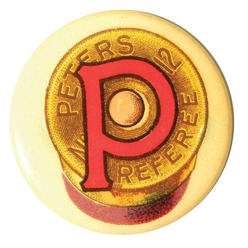 Celluloid Pinback advertising Peters Referee number 12, depicting a Shot Shell. Excellent condition. 7/8 inch diameter.