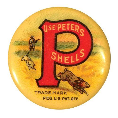 Celluloid Pinback advertising Use Peters Shells, trademark reg. US Pat. Off. Excellent condition. 7/8 inch diameter.
