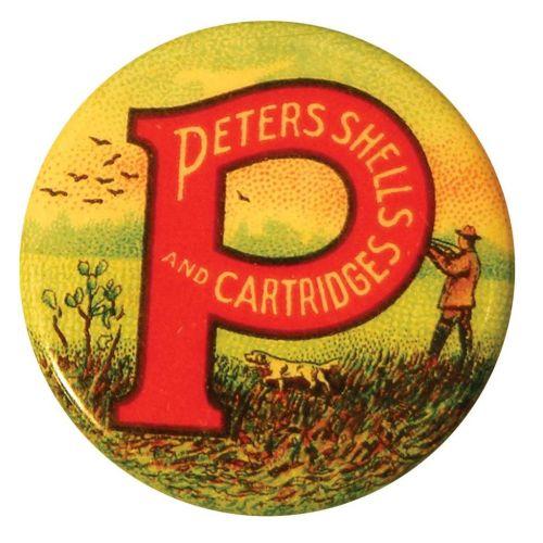 Celluloid Pinback advertising Peters Shells and Cartridges, depicting hunter, dog and ducks. Excellent condition. 7/8 inch diameter.