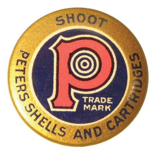 Celluloid Pinback advertising Shoot Peters Shells and Cartridges trade mark. Excellent condition. 7/8 inch diameter.