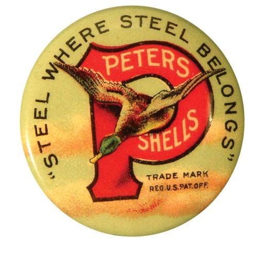 Celluloid Pinback advertising Peters Trade Mark, depicting a duck flying through the letter P, Steel Where Steel Belongs. Excellent condition. 7/8 inch diameter.