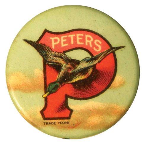 Celluloid Pinback advertising Peters Trade Mark, depicting a duck flying through the letter P. Excellent condition. 7/8 inch diameter.