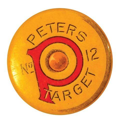 Celluloid Pinback advertising Peters number 12 Target. Excellent condition. 7/8 inch diameter.