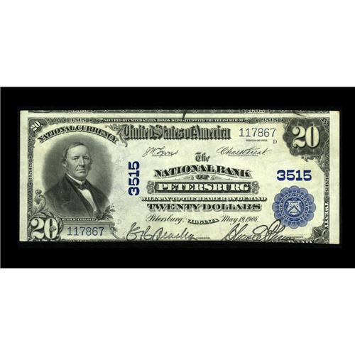 <B>Petersburg, VA</B></I> - $20 1902 Plain Back Fr. 651 <B>The NB of Petersburg</B></I> Ch. # 3515<BR>A <B>Very Fine</B></I> $20 Plain Back that is new to the census, making a total of just five of that type and denomination now documented from here.<BR><I>From The George P. Hammerly Collection</B></I><BR><BR><b>Shipping:</b> Coin/Currency (<a target="_blank" href="http://www.heritageauctions.com/common/shipping.php">view shipping information</a>)