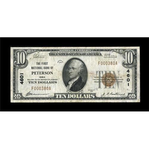 <B>Peterson, IA</B></I> - $10 1929 Ty. 1 <B>The First NB</B></I> Ch. # 4601<BR> The paper exhibited on this issue is pleasing and still shows remnants of embossing on the bank title. <B>Very Fine.</B></I><BR><BR><b>Shipping:</b> Coins & Currency (<a target="_blank" href="http://www.heritageauctions.com/common/shipping.php">view shipping information</a>)