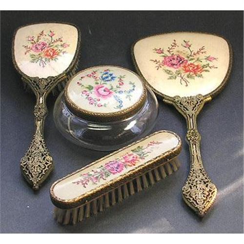 <tr><td>Title:Petit Point Emroidered and Brass Dresser Set</td></tr>