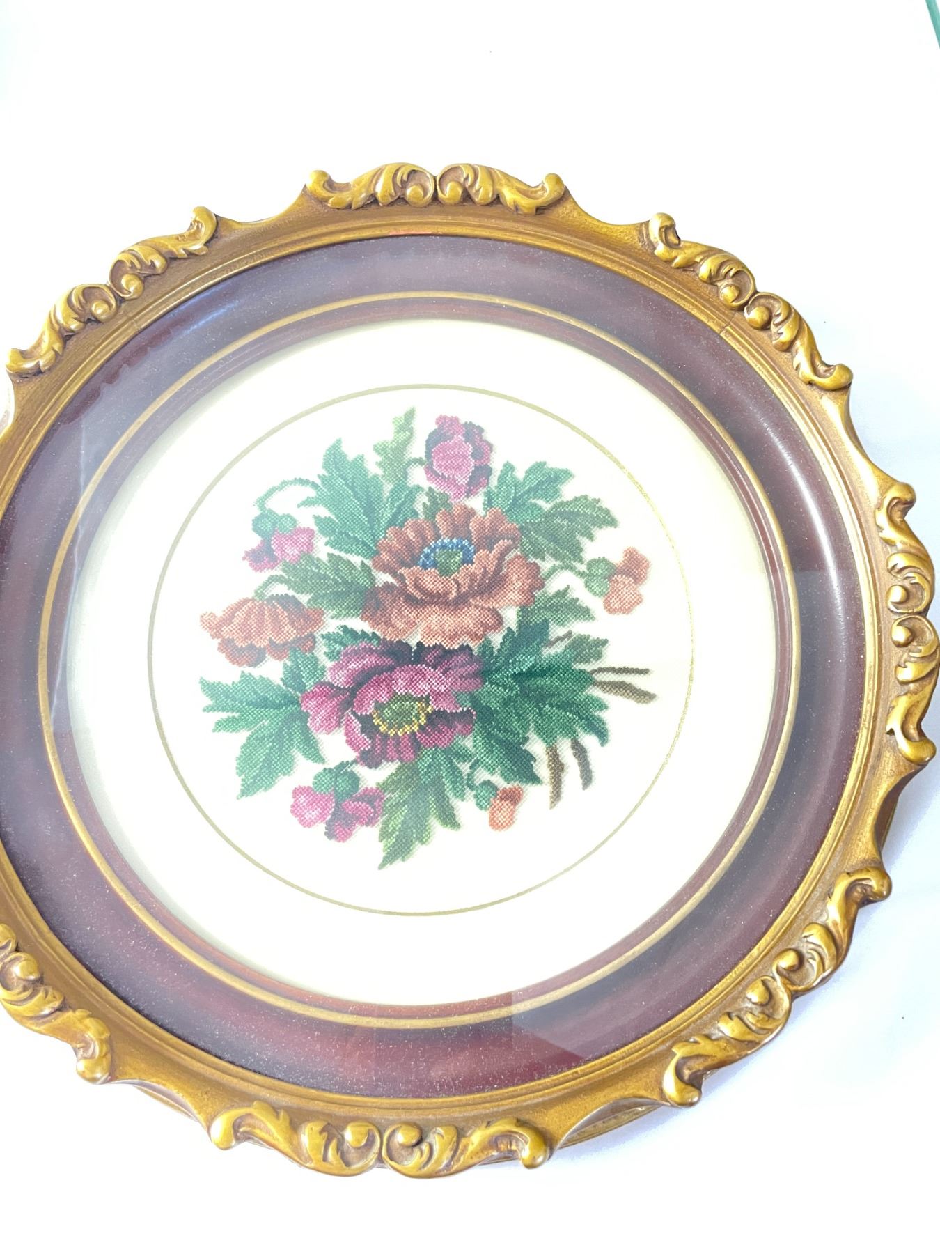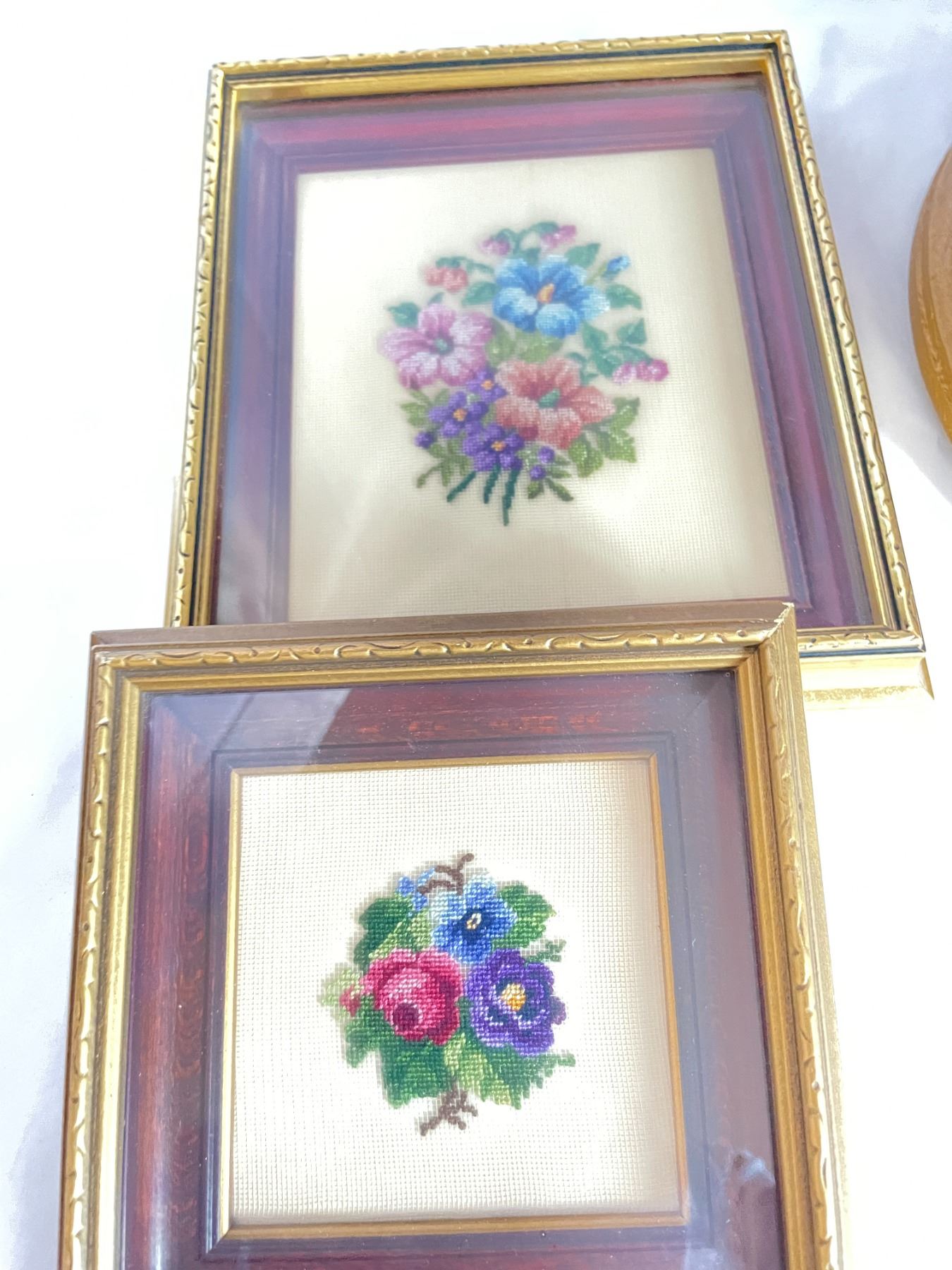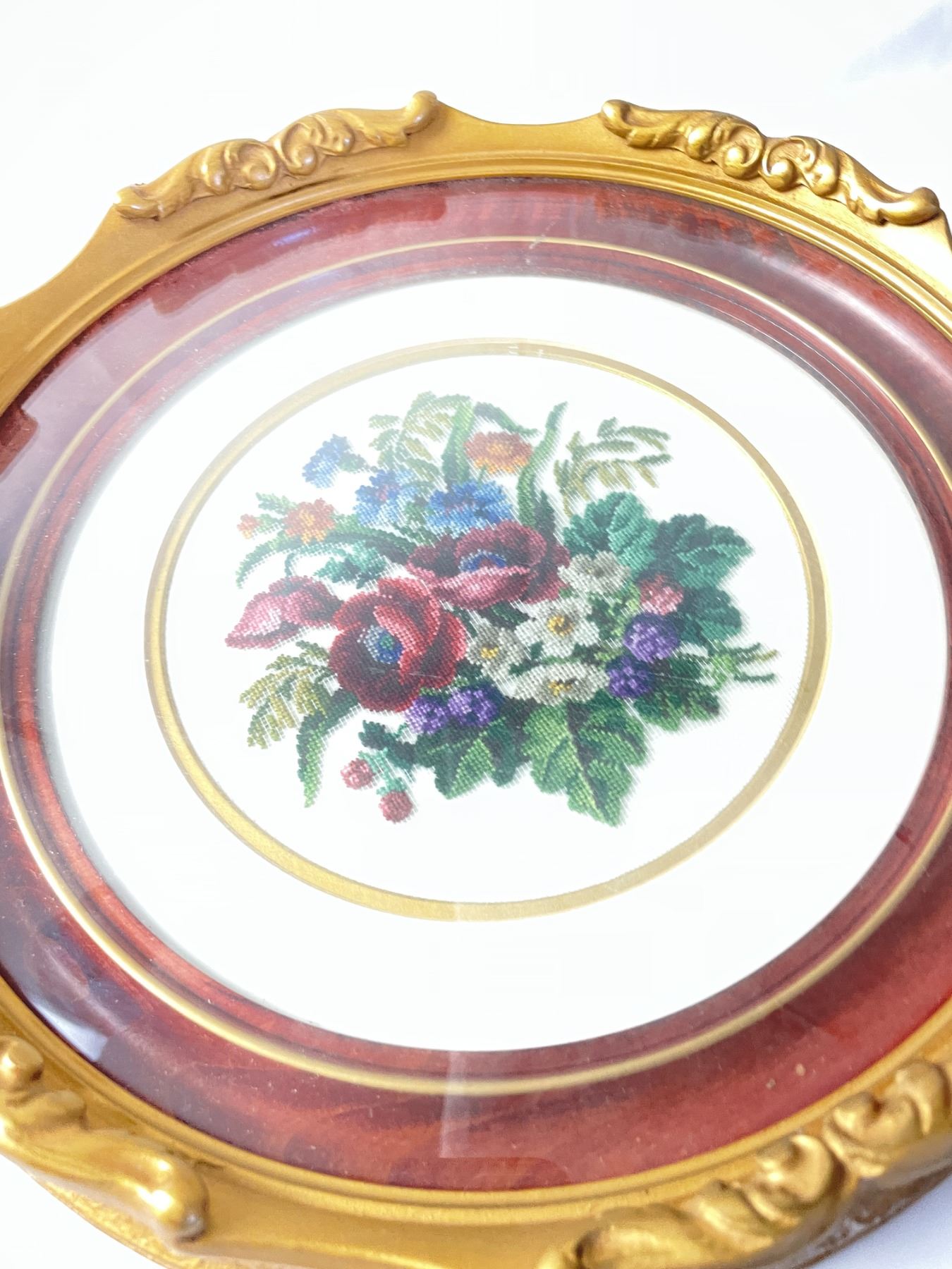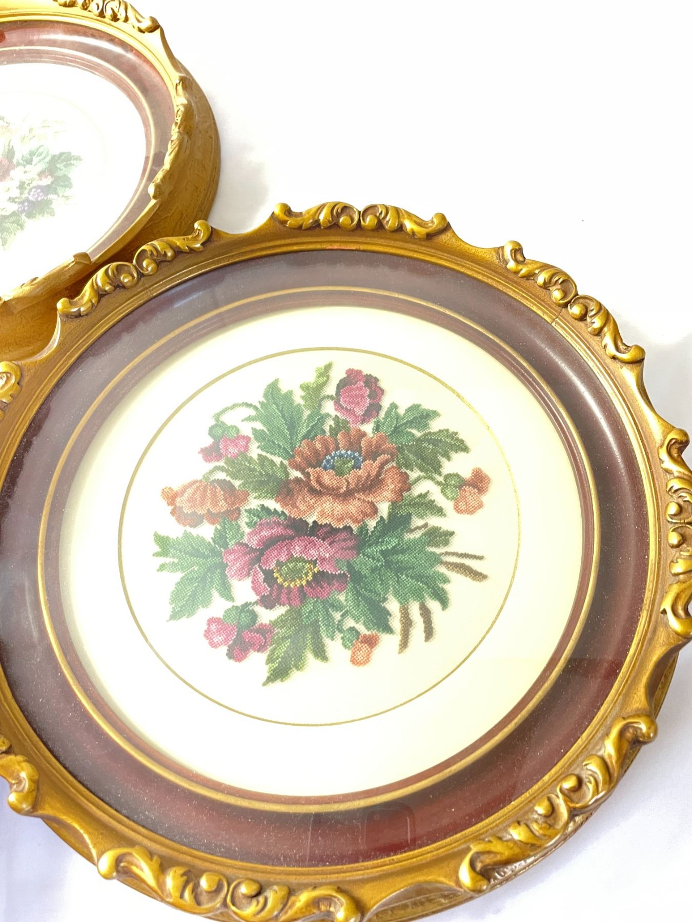 3 petit point flowers in circular frames 12.5" diameter and 2 petit point flowers in rectangular frames - dimension 8" length x 6.5" wide.