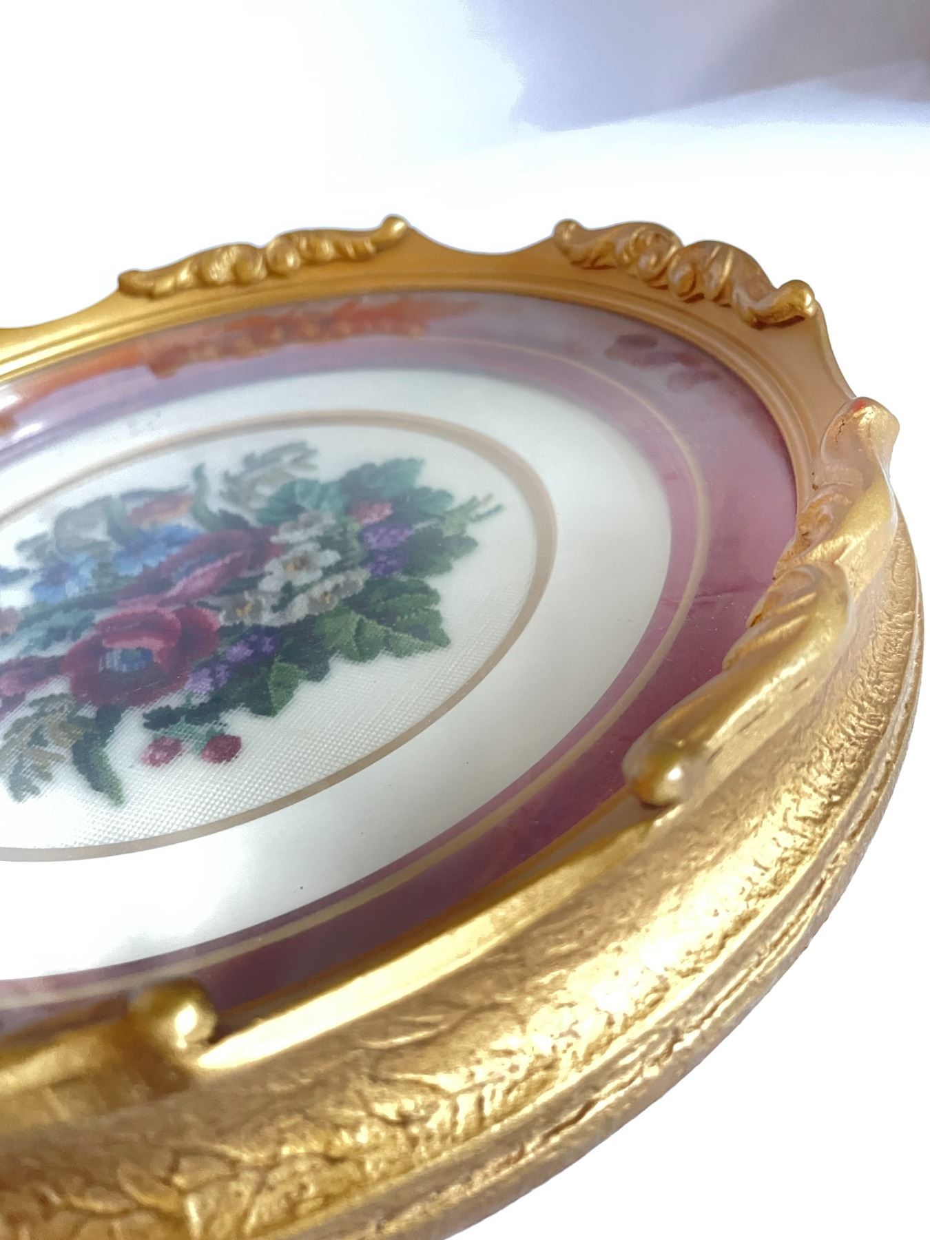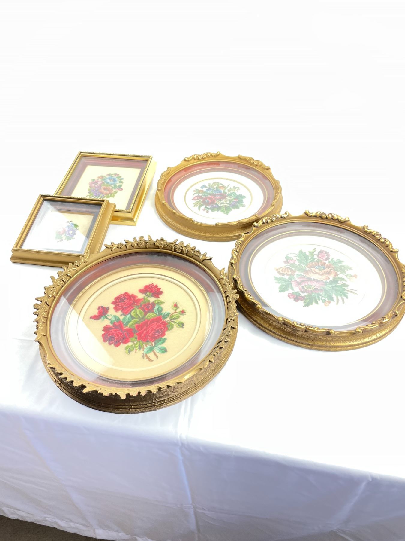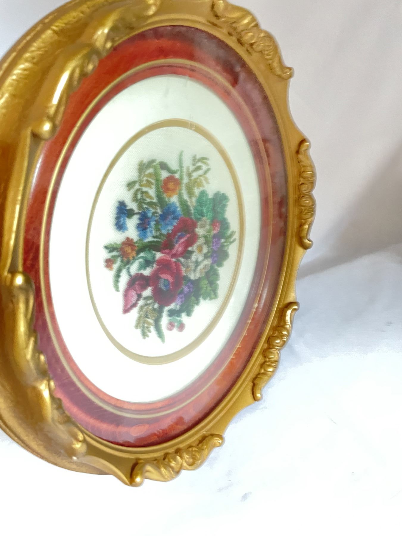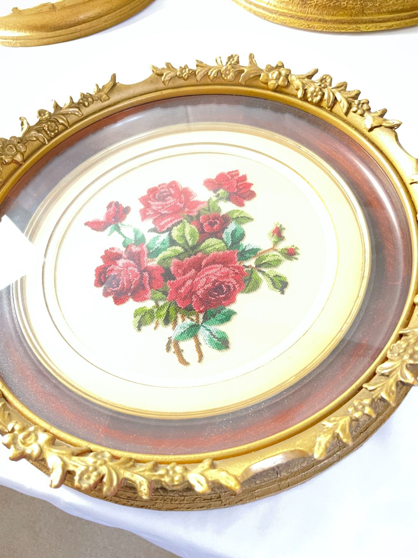 3 petit point flowers in circular frames 12.5" diameter and 2 petit point flowers in rectangular frames - dimension 8" length x 6.5" wide.