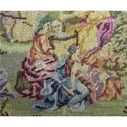 Petit-point purse 8 1/2" x 6" purse with garden scene of woman playing musical instruments, jeweled clasp 13" brass chain handle, satin lining, purse is unmarked Estimate 100/140