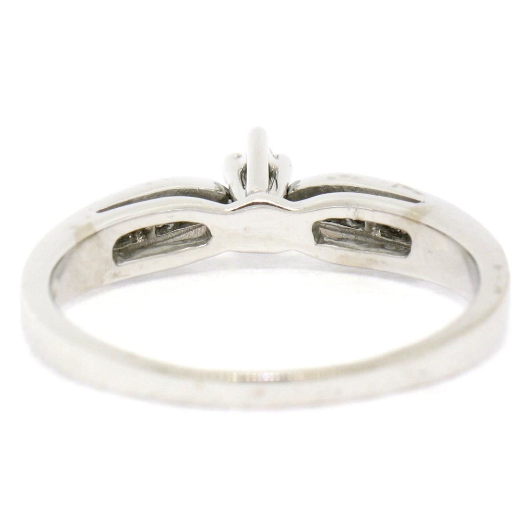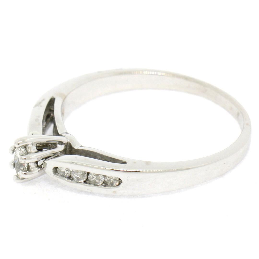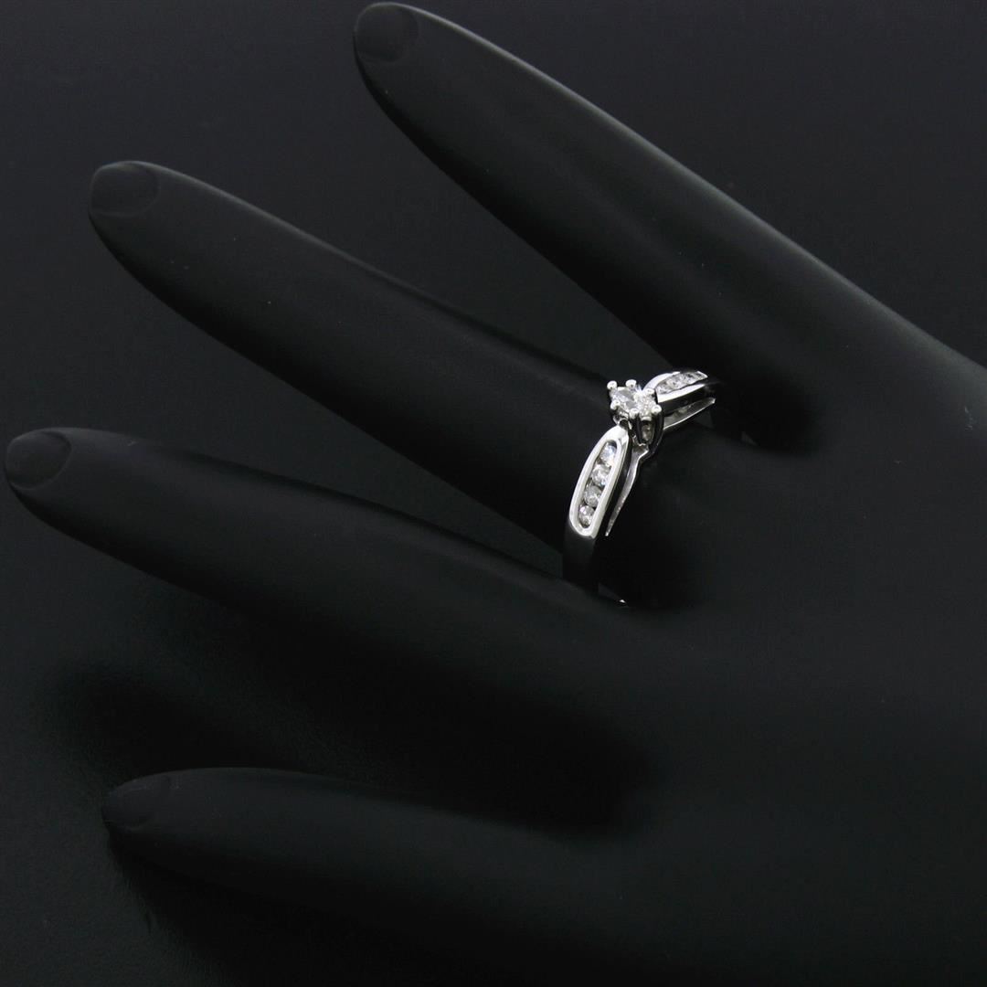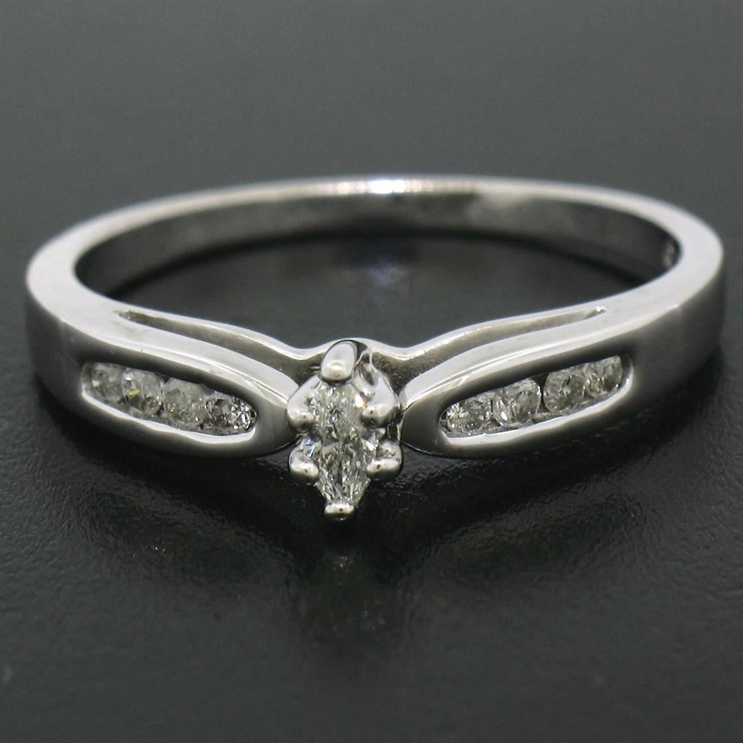 An estate solid 10k white gold solitaire ring, featuring 1 marquise cut natural diamond (H- VS2; 0.14ct). accented with 8 round brilliant cut natural diamonds (H - SI1/SI2; 0.25ctw). The ring is size 7.0, weighs a total of 2.4 grams, and measures 5.2mm wide.