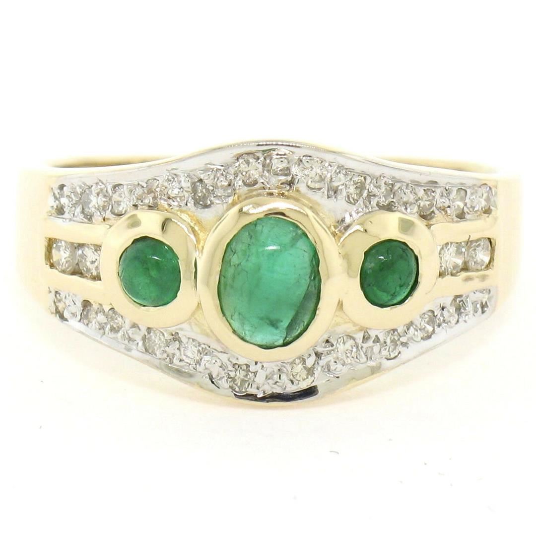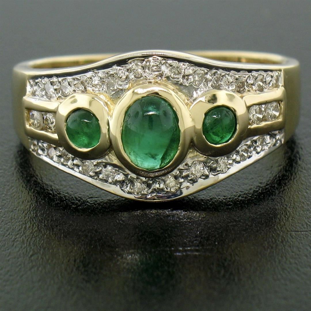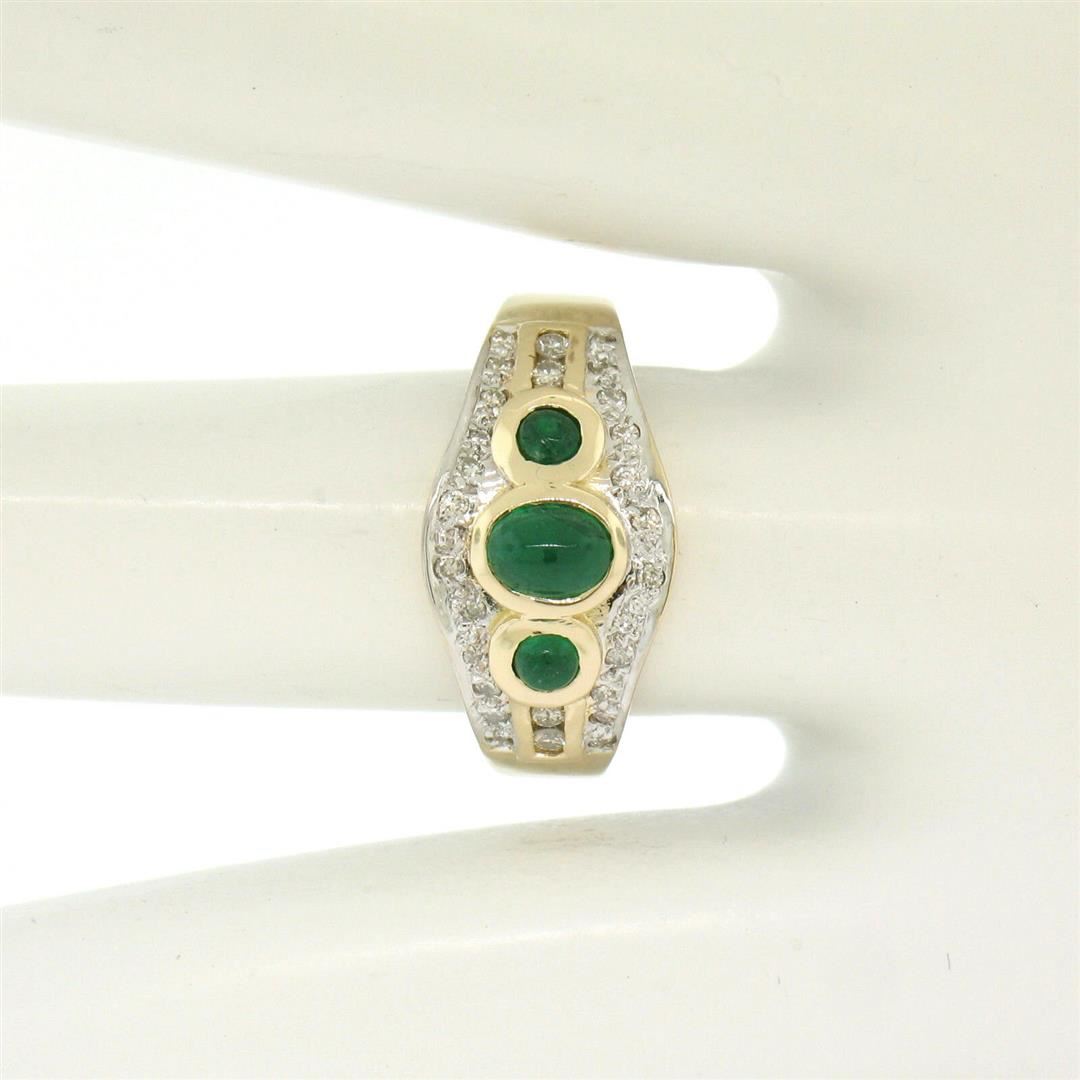One Petite 14K TT Gold 0.68ctw 3 Cabochon Emerald & Diamond Accented Cocktail Ring. Item Details: Material: 14K Solid Yellow and White Gold, Weight: 4.41 Grams, Stone(s): (3) Natural Genuine Emeralds - Cabochon Cut - Bezel Set - Rich Green Color - 0.40ctw (approx.), (25) Natural Genuine Diamonds - Round Brilliant Cut - Pave & Channel Set - VS2/SI1 Clarity - G/H Color - 0.28ctw (approx.), Total Carat Weight: 0.68 (approx.), Ring Size: 6.5 , Ring Width: 9.88mm, Ring Height: 4.88mm rise off the finger Condition: Like New!