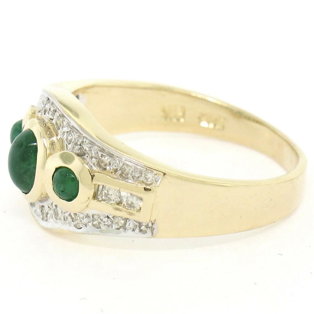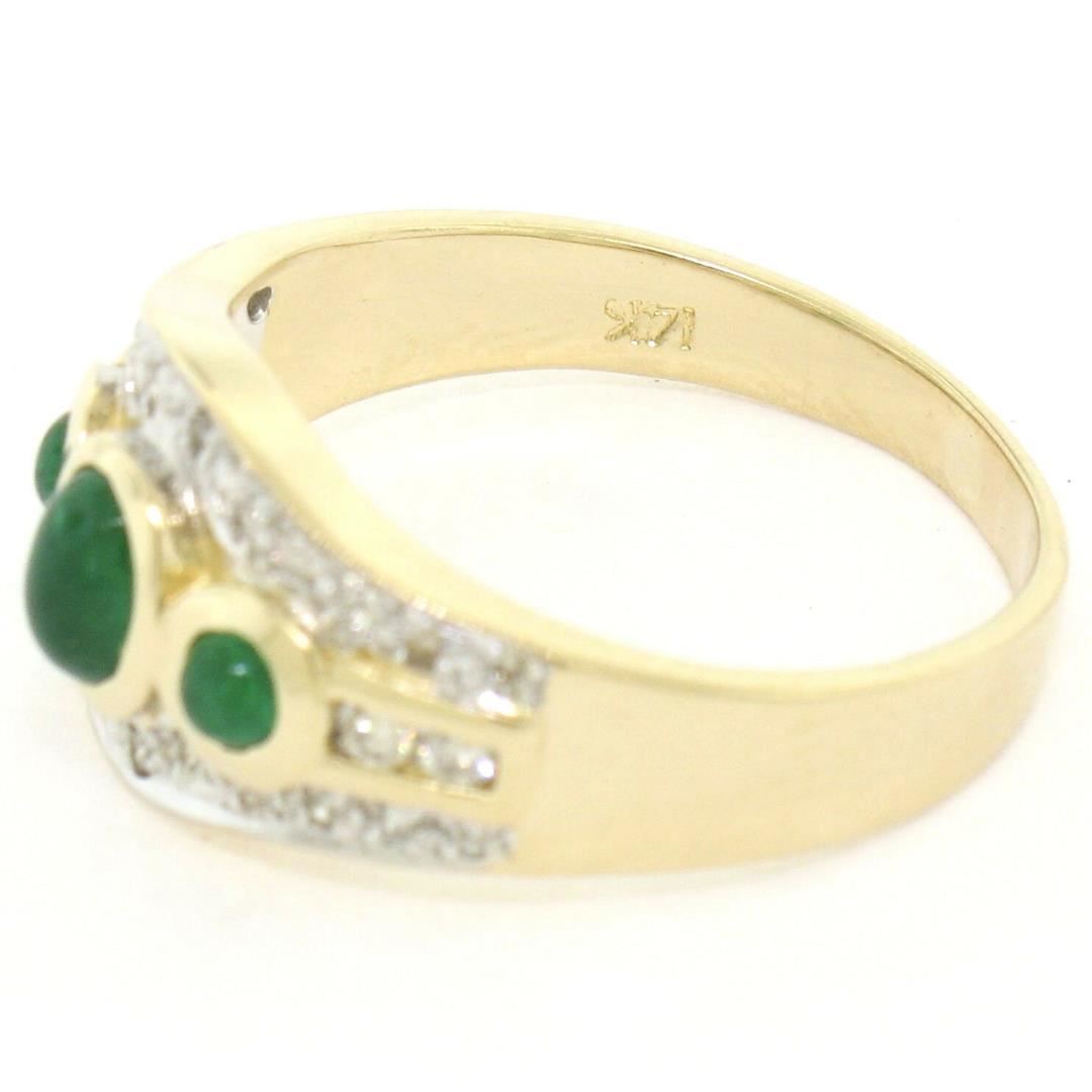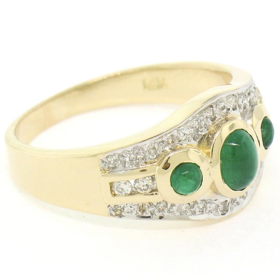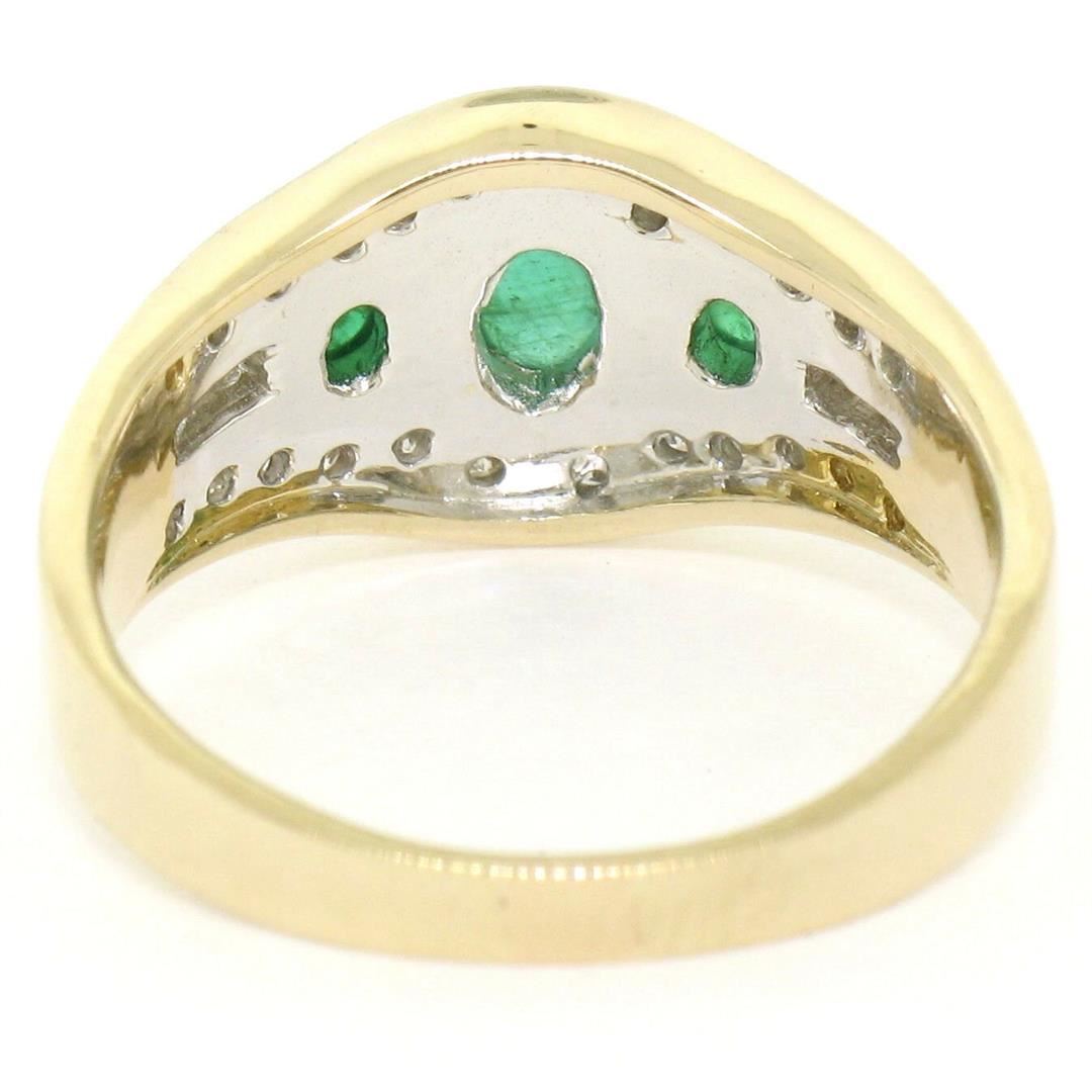 One Petite 14K TT Gold 0.68ctw 3 Cabochon Emerald & Diamond Accented Cocktail Ring. Item Details: Material: 14K Solid Yellow and White Gold, Weight: 4.41 Grams, Stone(s): (3) Natural Genuine Emeralds - Cabochon Cut - Bezel Set - Rich Green Color - 0.40ctw (approx.), (25) Natural Genuine Diamonds - Round Brilliant Cut - Pave & Channel Set - VS2/SI1 Clarity - G/H Color - 0.28ctw (approx.), Total Carat Weight: 0.68 (approx.), Ring Size: 6.5 , Ring Width: 9.88mm, Ring Height: 4.88mm rise off the finger Condition: Like New!