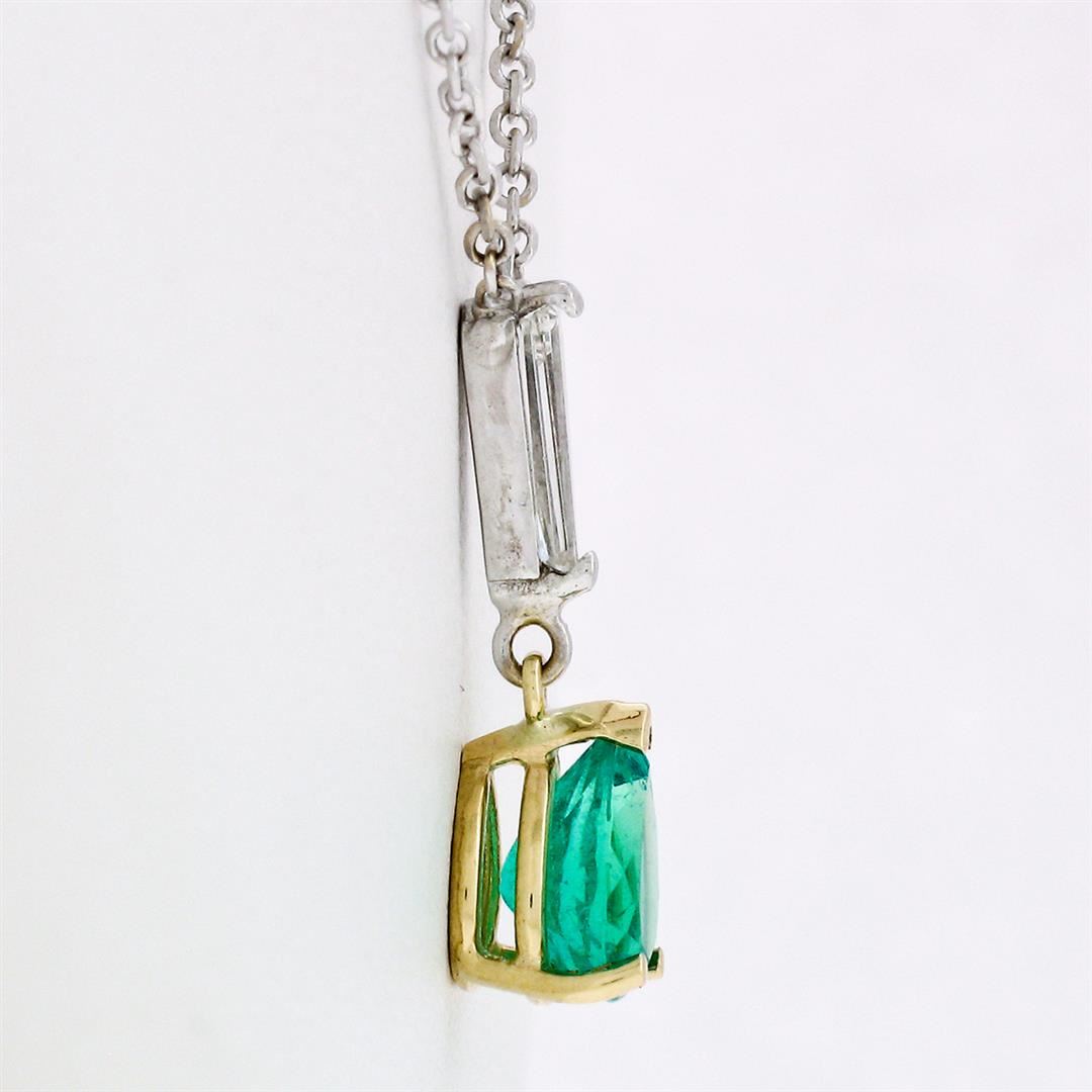 a new solid 14k yellow & white gold petite pendant, with 1 pear cut natural emerald (0.61ct - 7.0x4.90mm), and 1 long tapered baguette cut natural diamond (G- VVS2; 0.20ct). The pendant weighs a total of 2.30 grams, measures 17.15x4.90mm including the bail, and an adjustable 16 or 18 inch cable link chain.