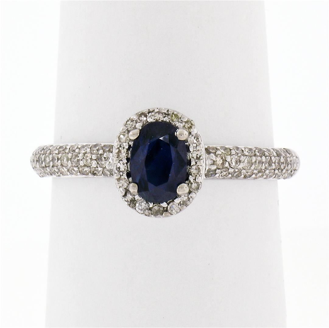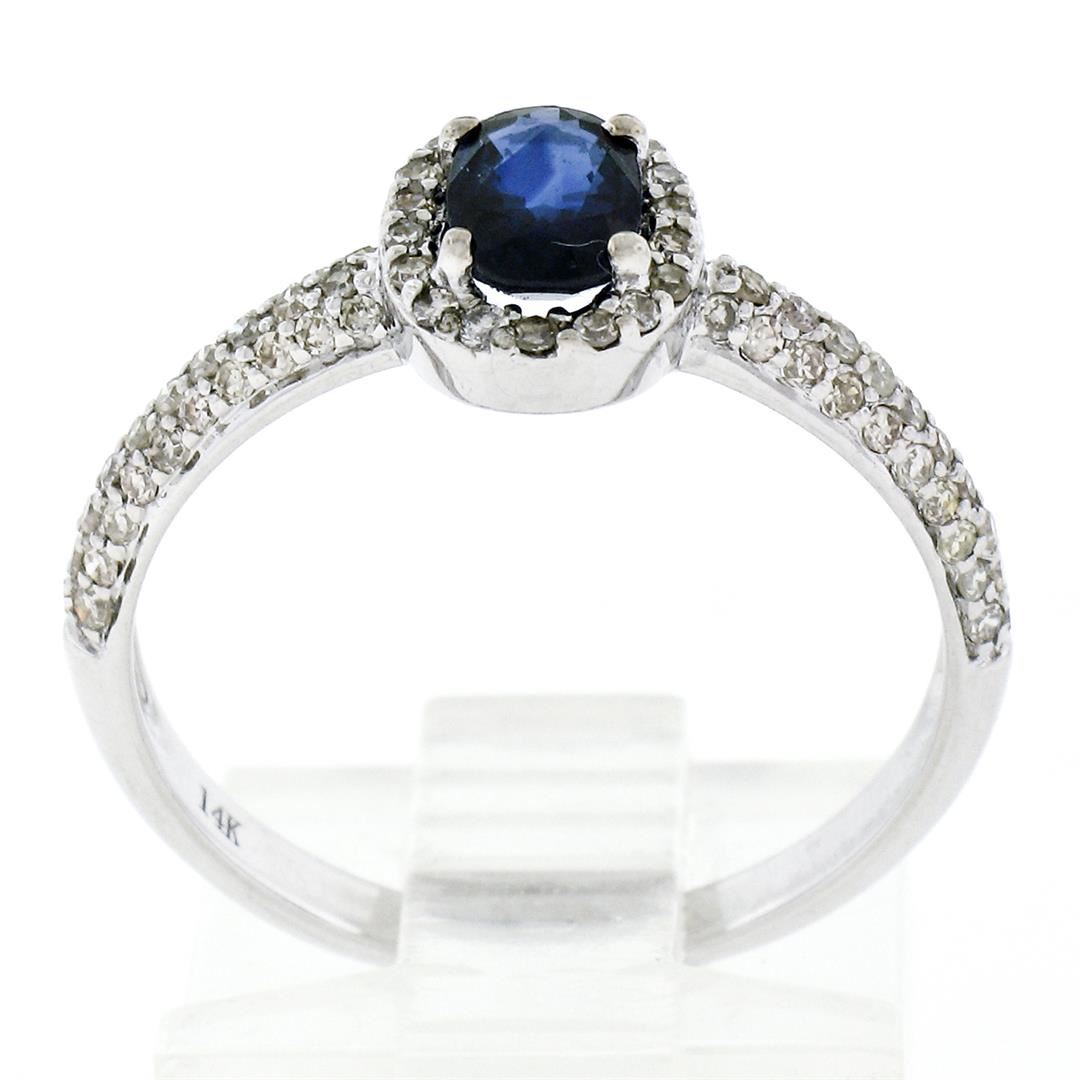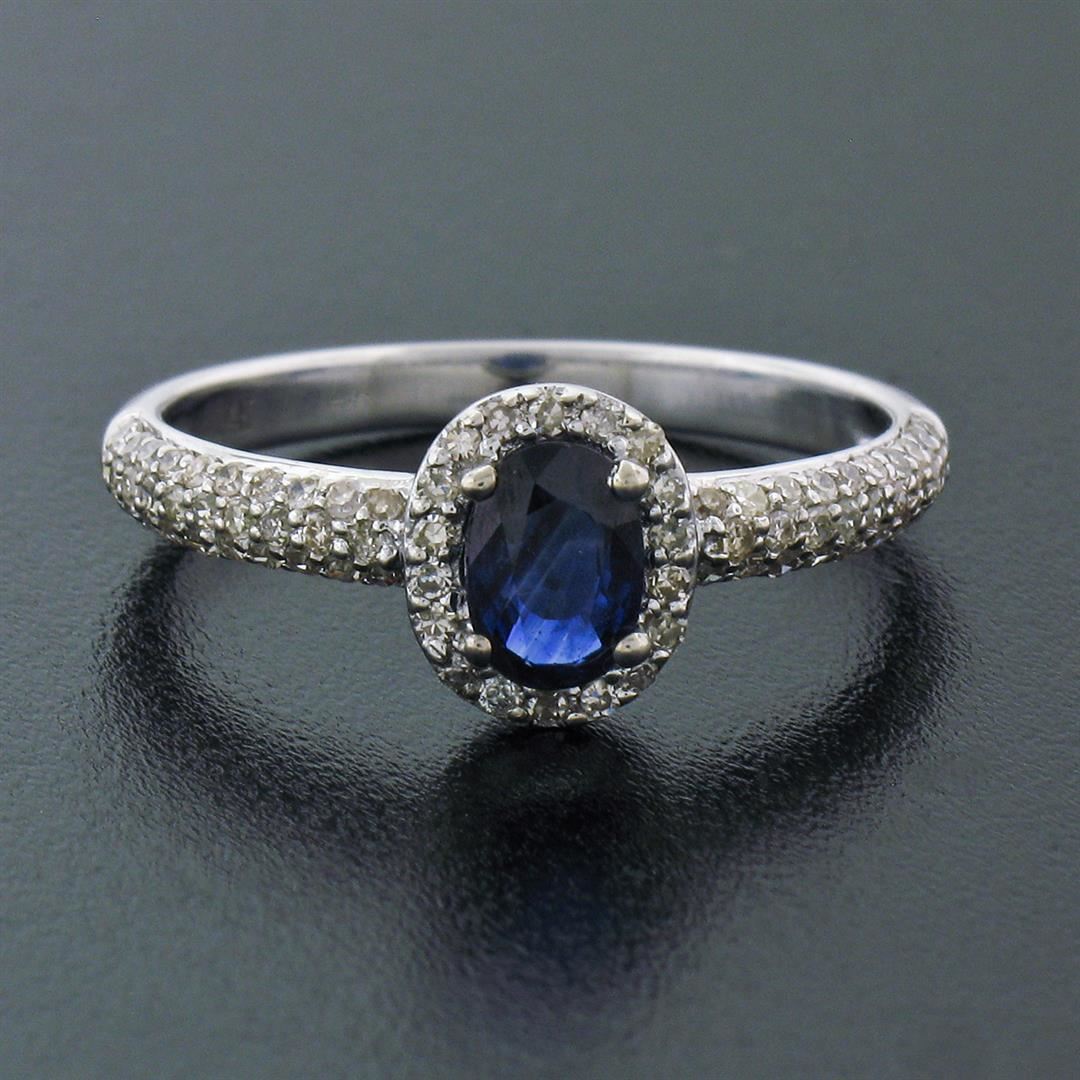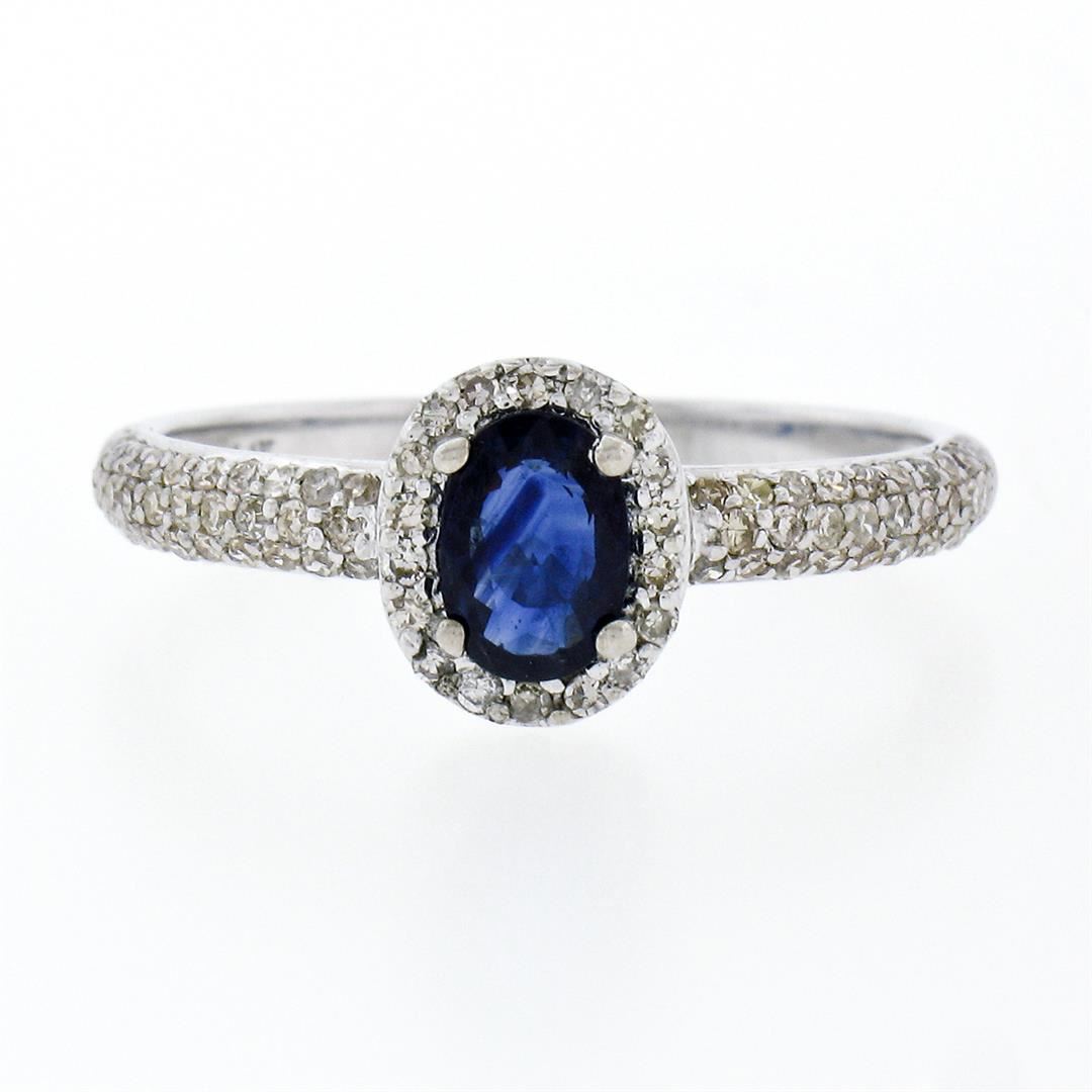 An estate solid 14k white gold petite solitaire ring, featuring 1 oval cut natural sapphire (4.2x6.0mm- 0.65ct), surrounded with 78 round single cut natural diamonds ( H/I - VS2; 0.40ctw ). The ring is size 7.0, weighs a total of 2.21 grams, and measures 8.10mm wide.