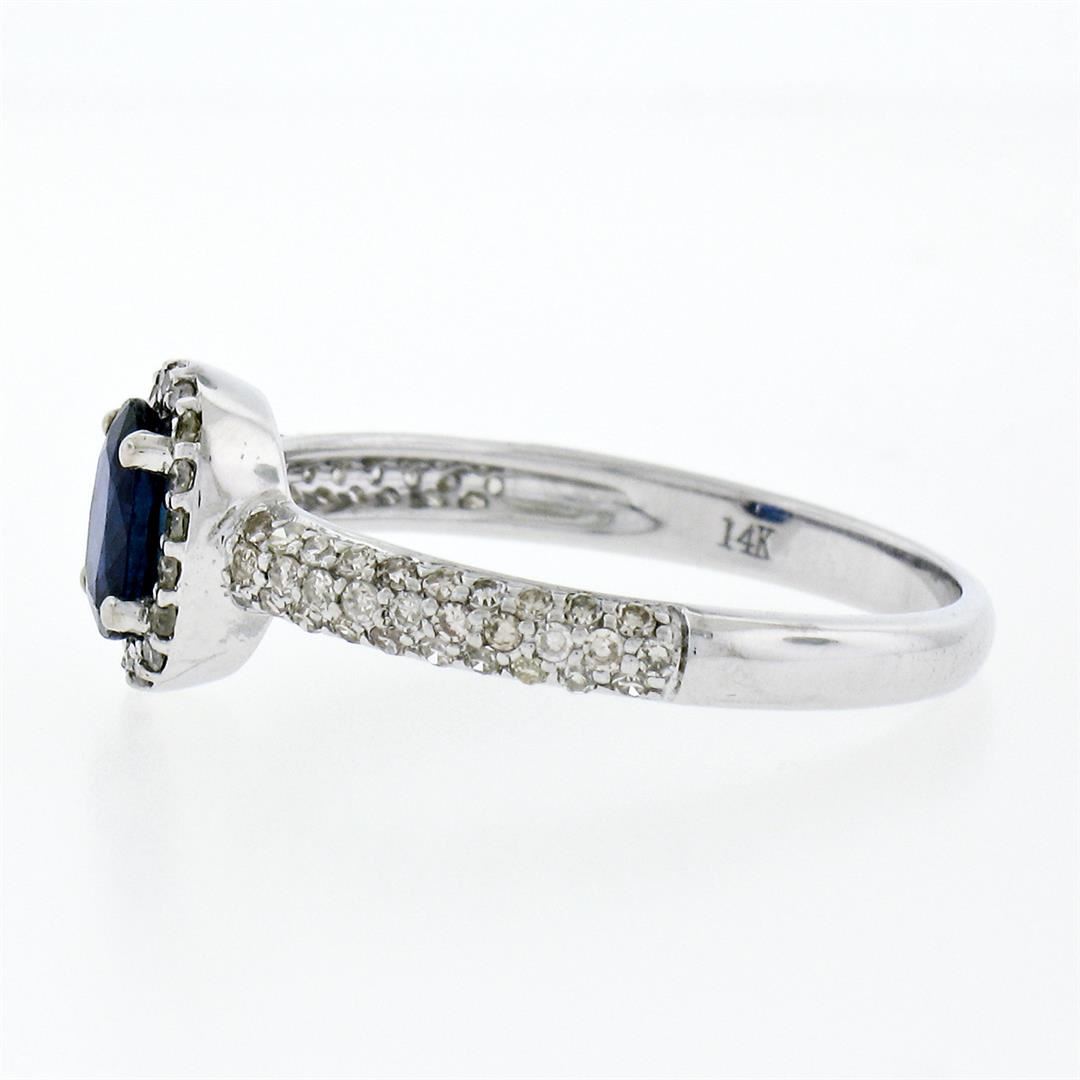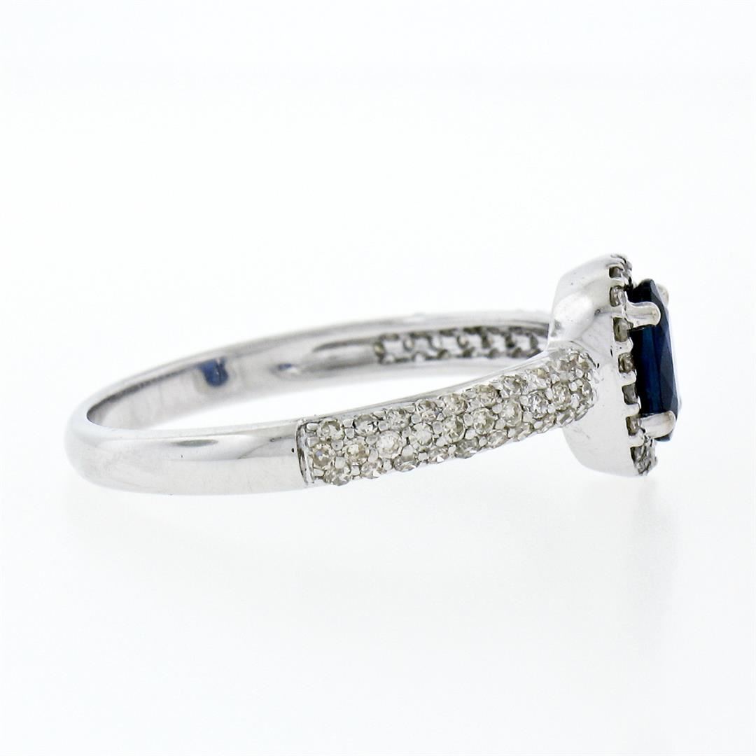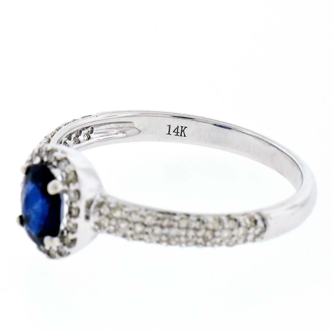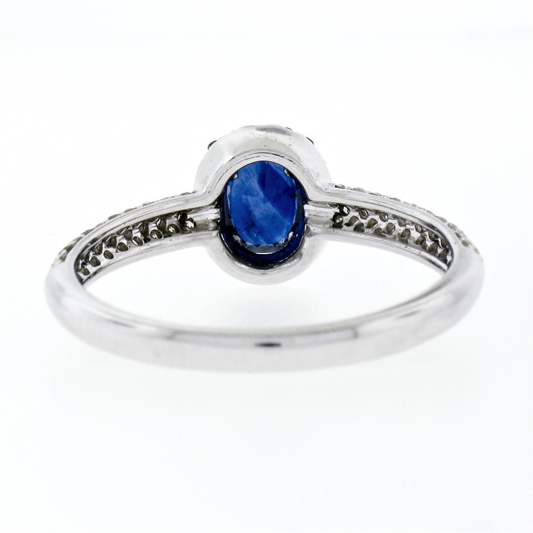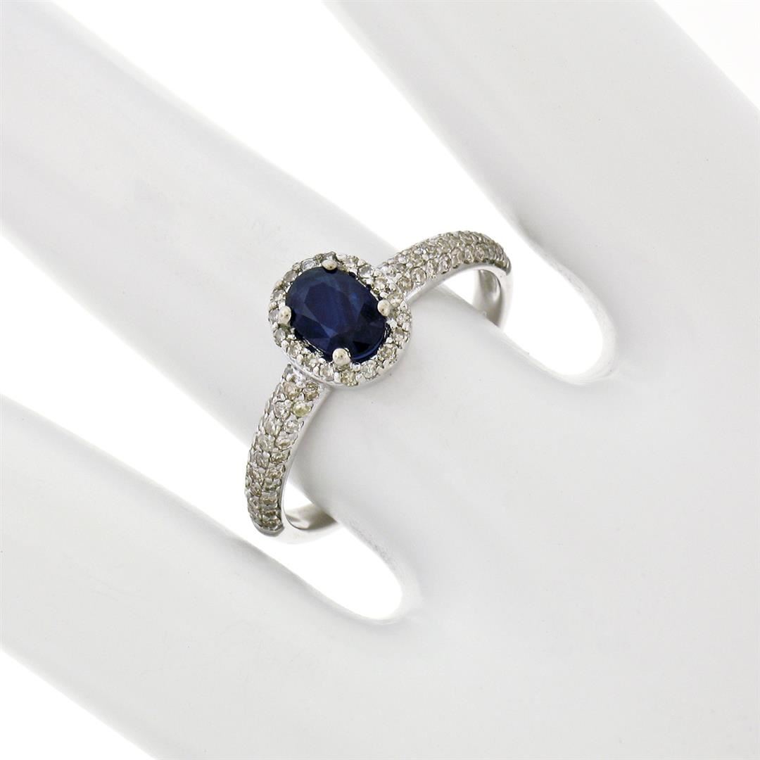An estate solid 14k white gold petite solitaire ring, featuring 1 oval cut natural sapphire (4.2x6.0mm- 0.65ct), surrounded with 78 round single cut natural diamonds ( H/I - VS2; 0.40ctw ). The ring is size 7.0, weighs a total of 2.21 grams, and measures 8.10mm wide.