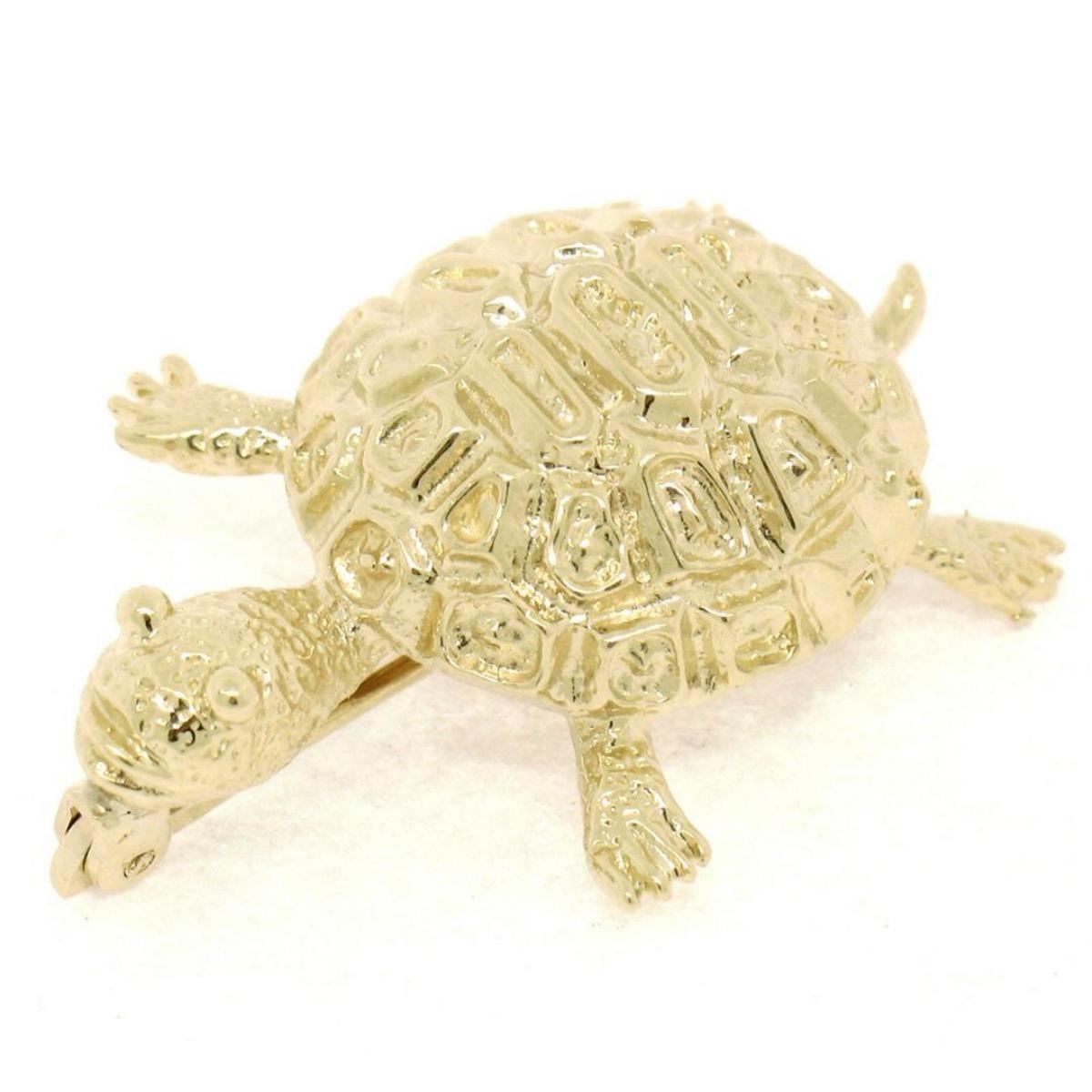 A petite, highly detailed and textured, solid 14k yellow gold turtle brooch. Measures 27.2x20.6mm and weighs a total of 4.33 grams.