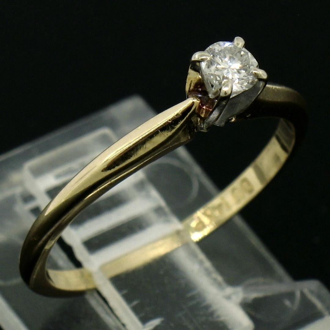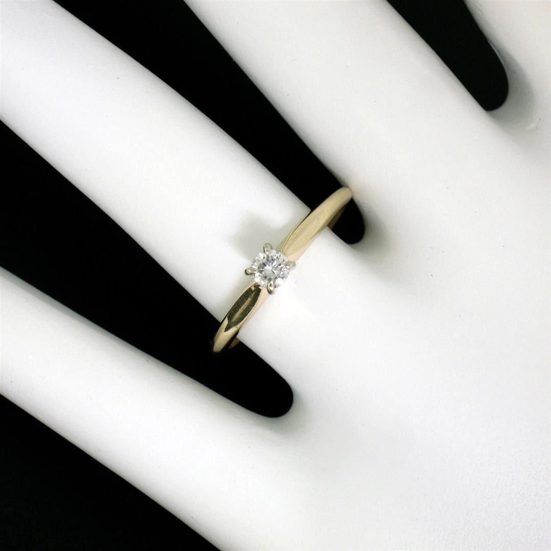 An estate solid 14k yellow and white gold solitaire ring, with 1 round brilliant cut natural diamond (H - SI1; 0.15ct). The ring is size 5.5, weighs a total of 1.55 grams, and measures 3.31mm wide.