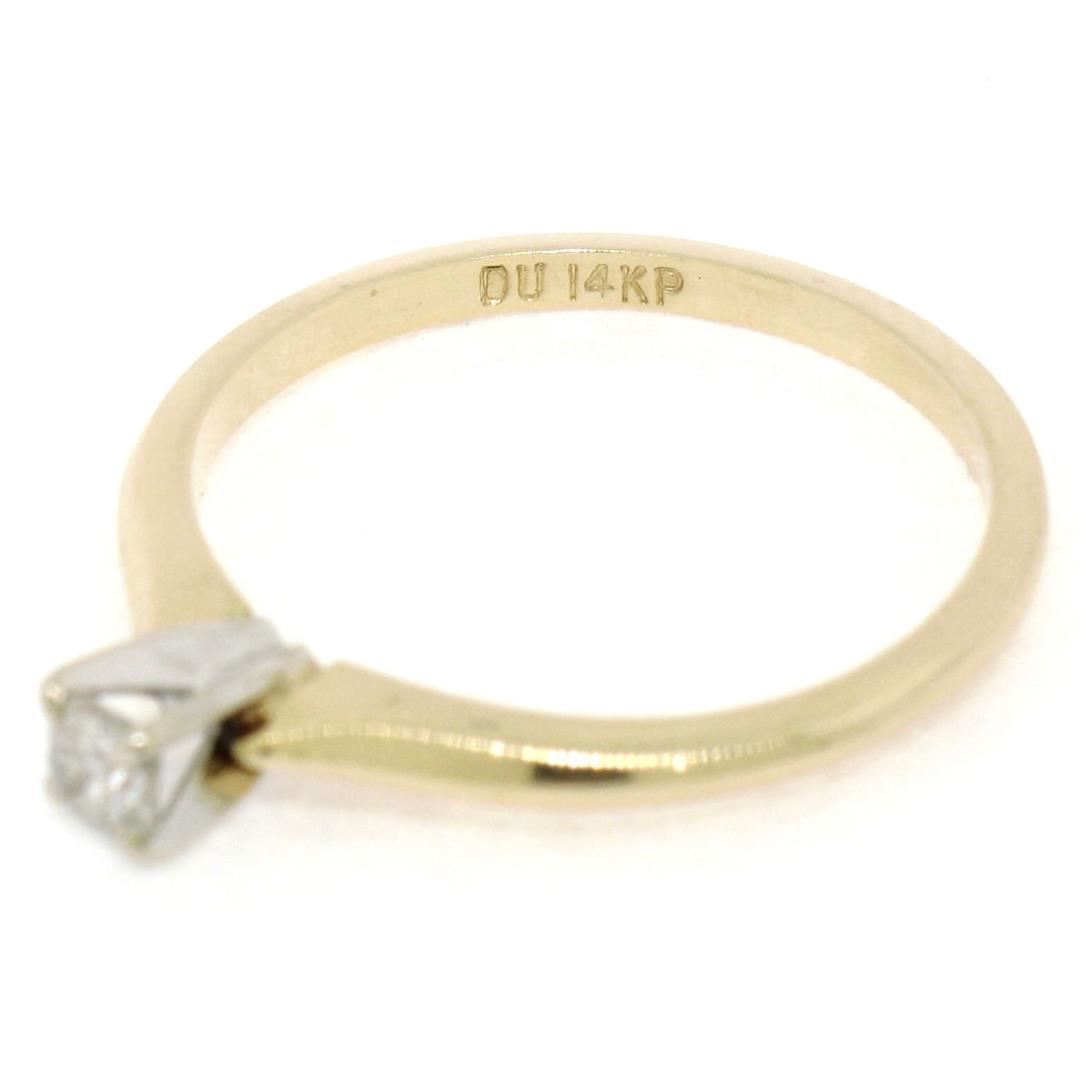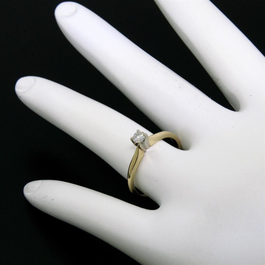 An estate solid 14k yellow and white gold solitaire ring, with 1 round brilliant cut natural diamond (H - SI1; 0.15ct). The ring is size 5.5, weighs a total of 1.55 grams, and measures 3.31mm wide.