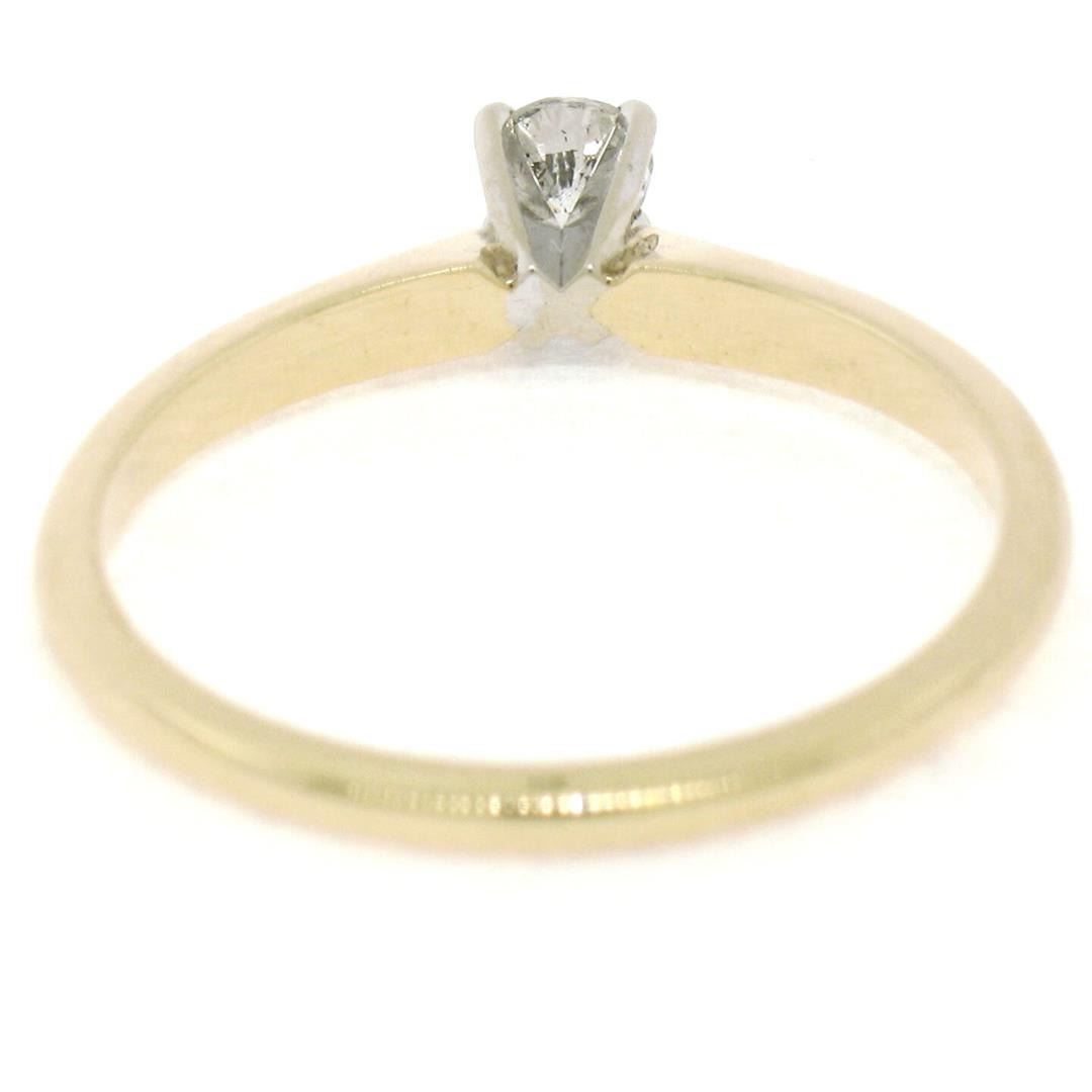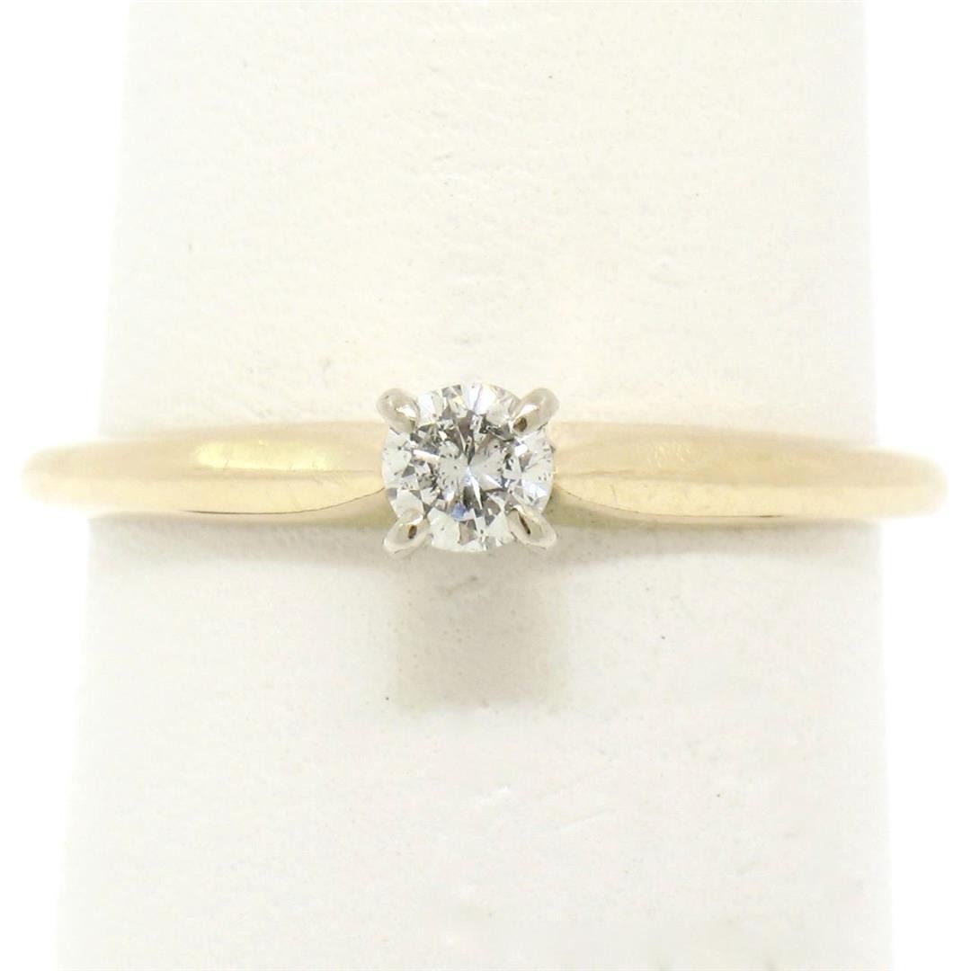 An estate solid 14k yellow and white gold solitaire ring, with 1 round brilliant cut natural diamond (H - SI1; 0.15ct). The ring is size 5.5, weighs a total of 1.55 grams, and measures 3.31mm wide.