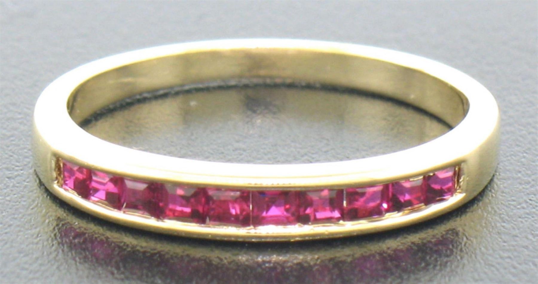 One Petite 18k Yellow Gold 0.50ctw Rare Square Cut Blood Red Ruby Channel Band Ring. Item Details: Material: 18k Solid Gold, Weight: 1.90 Grams, Stone: (10) Natural Genuine Rubies - Rich Blood Red Color - Square Cut - Channel Set - 0.50ctw (approx.), Dimensions/Size: Measures 2.60mm wide and is a size 4.50, WE CAN CUSTOM SIZE!, Condition: 100% LIKE NEW