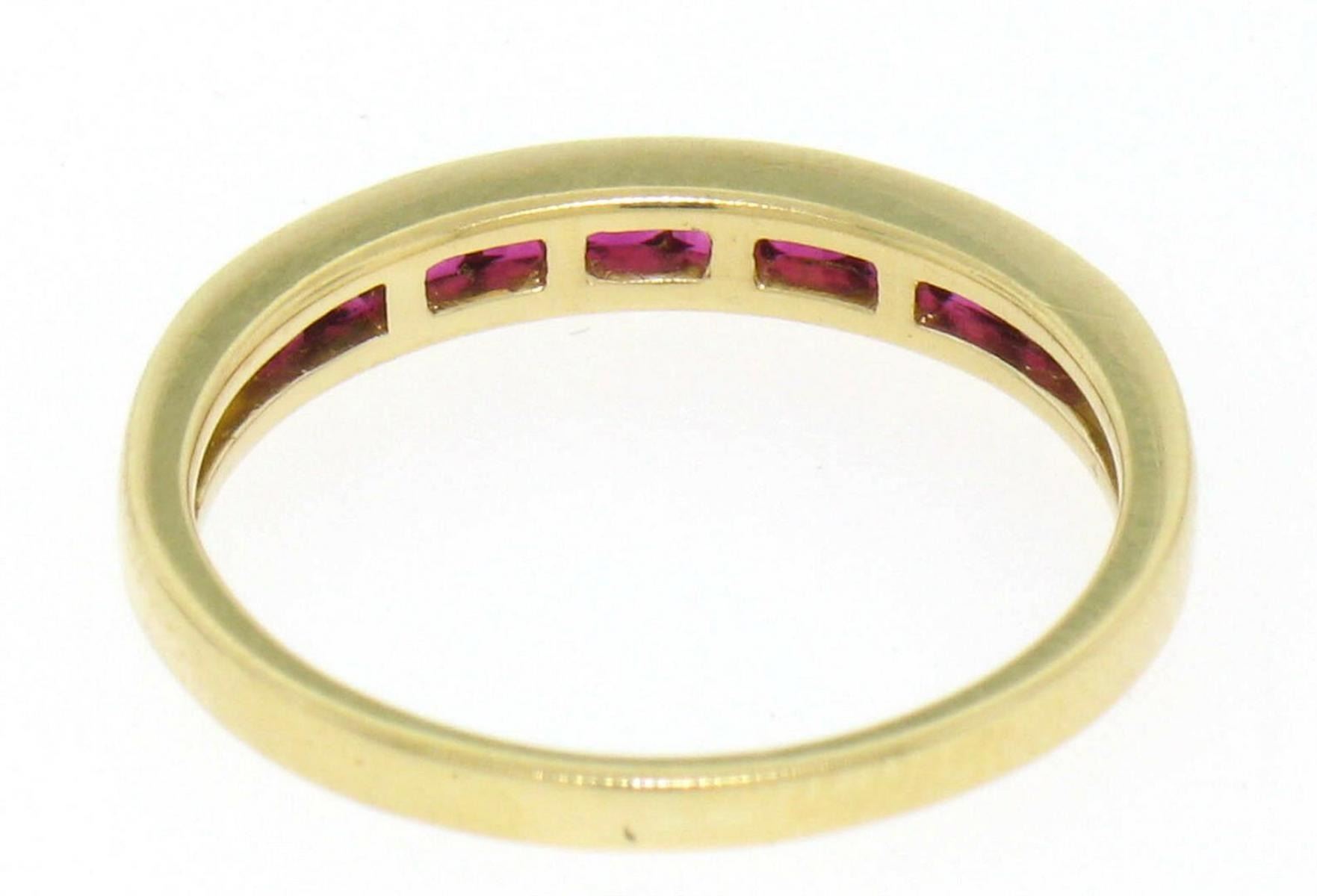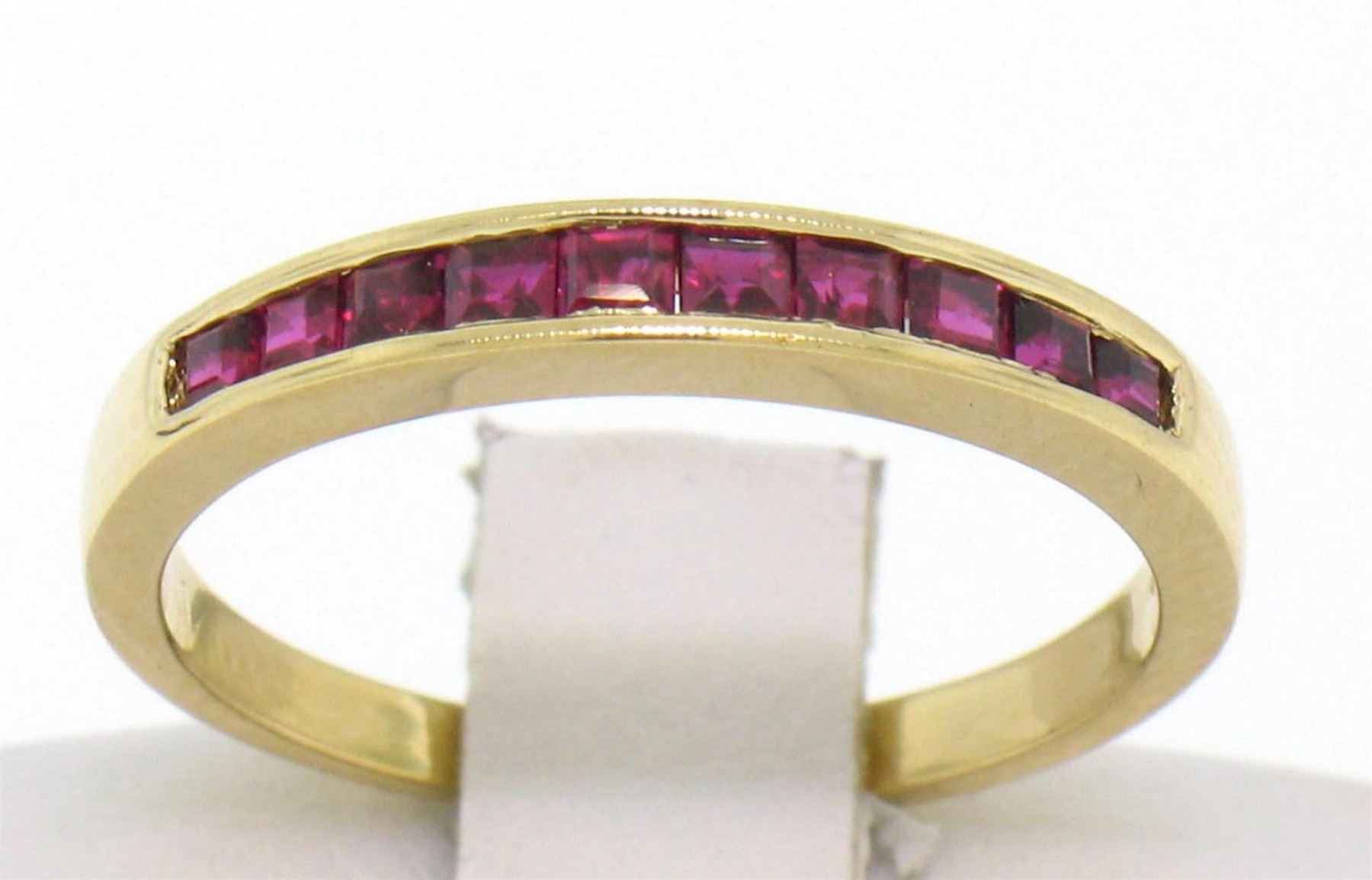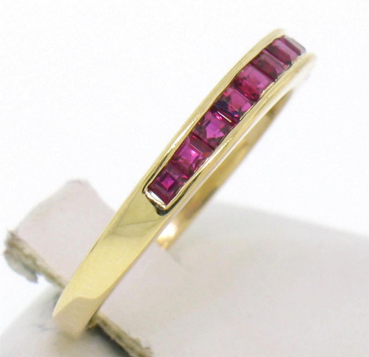 One Petite 18k Yellow Gold 0.50ctw Rare Square Cut Blood Red Ruby Channel Band Ring. Item Details: Material: 18k Solid Gold, Weight: 1.90 Grams, Stone: (10) Natural Genuine Rubies - Rich Blood Red Color - Square Cut - Channel Set - 0.50ctw (approx.), Dimensions/Size: Measures 2.60mm wide and is a size 4.50, WE CAN CUSTOM SIZE!, Condition: 100% LIKE NEW