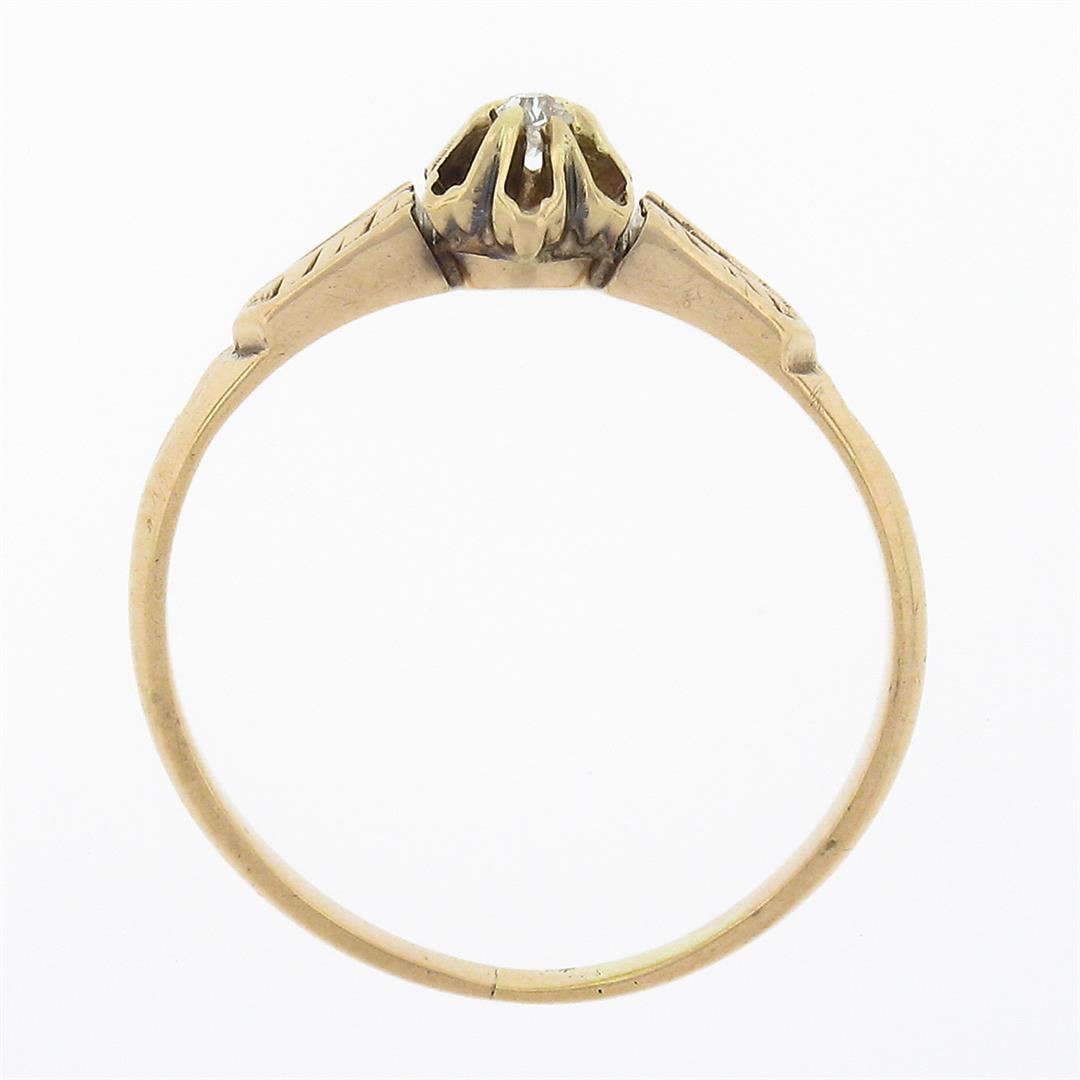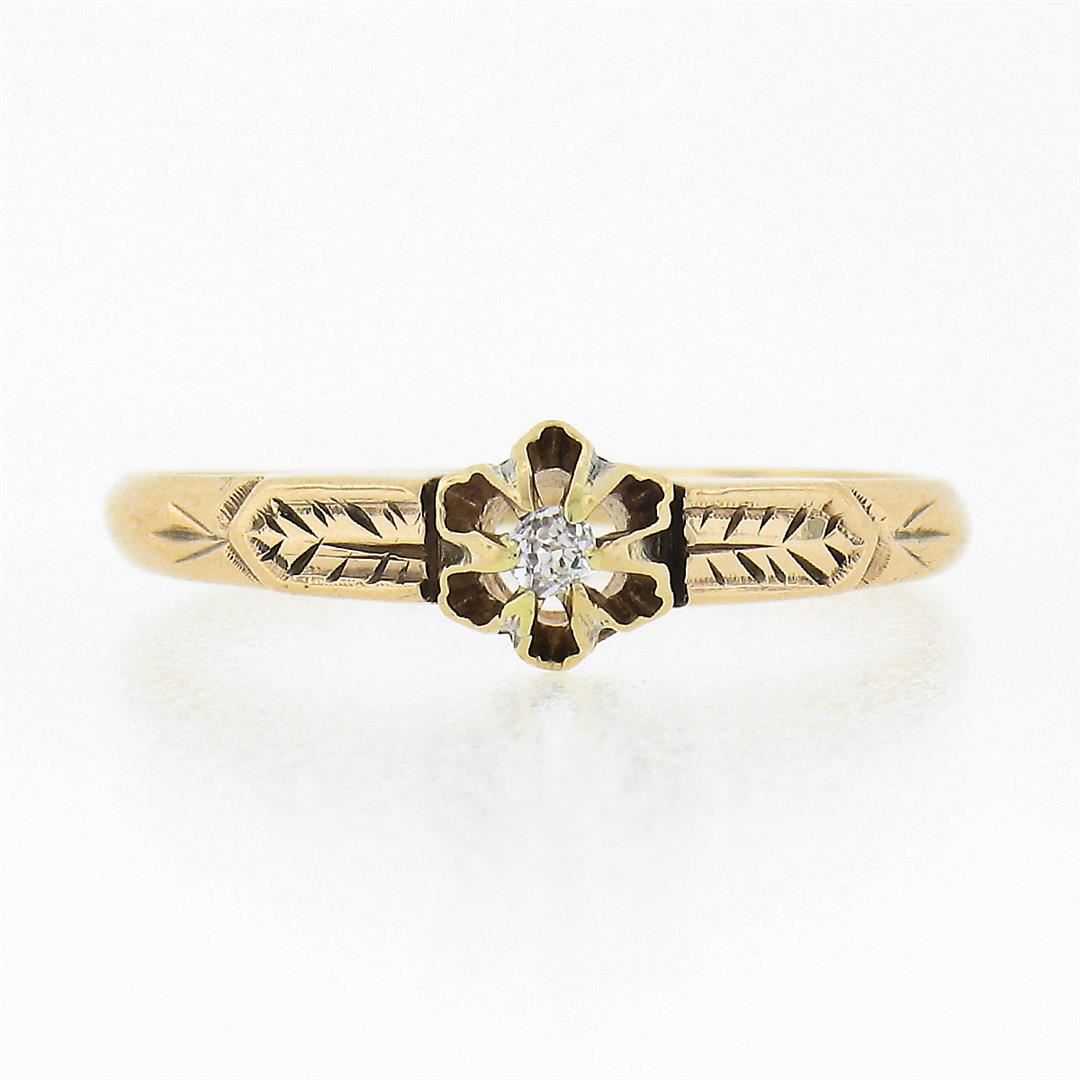 Petite Antique 14K Gold Buttercup Prong Set Diamond Solitaire Hand Engraved Ring
