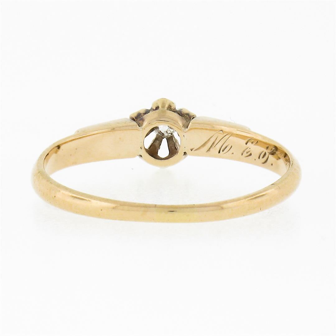 An antique solid 14k yellow gold ring, with 1 old mine cut natural diamond (G - VS2; 0.03ct). The ring is size 6.0, weighs a total of 1.30 grams, and measures 5.10mm wide.