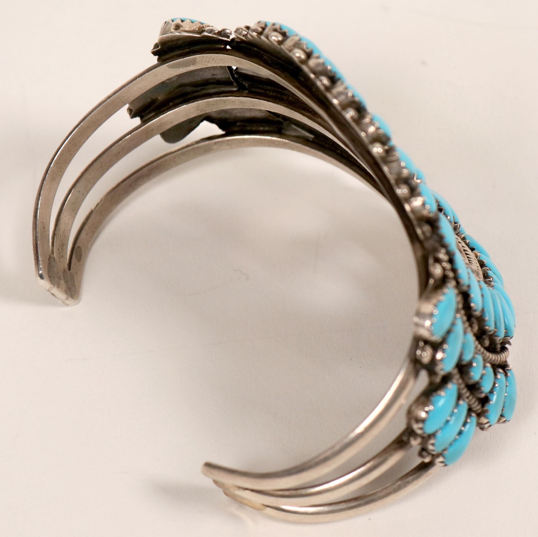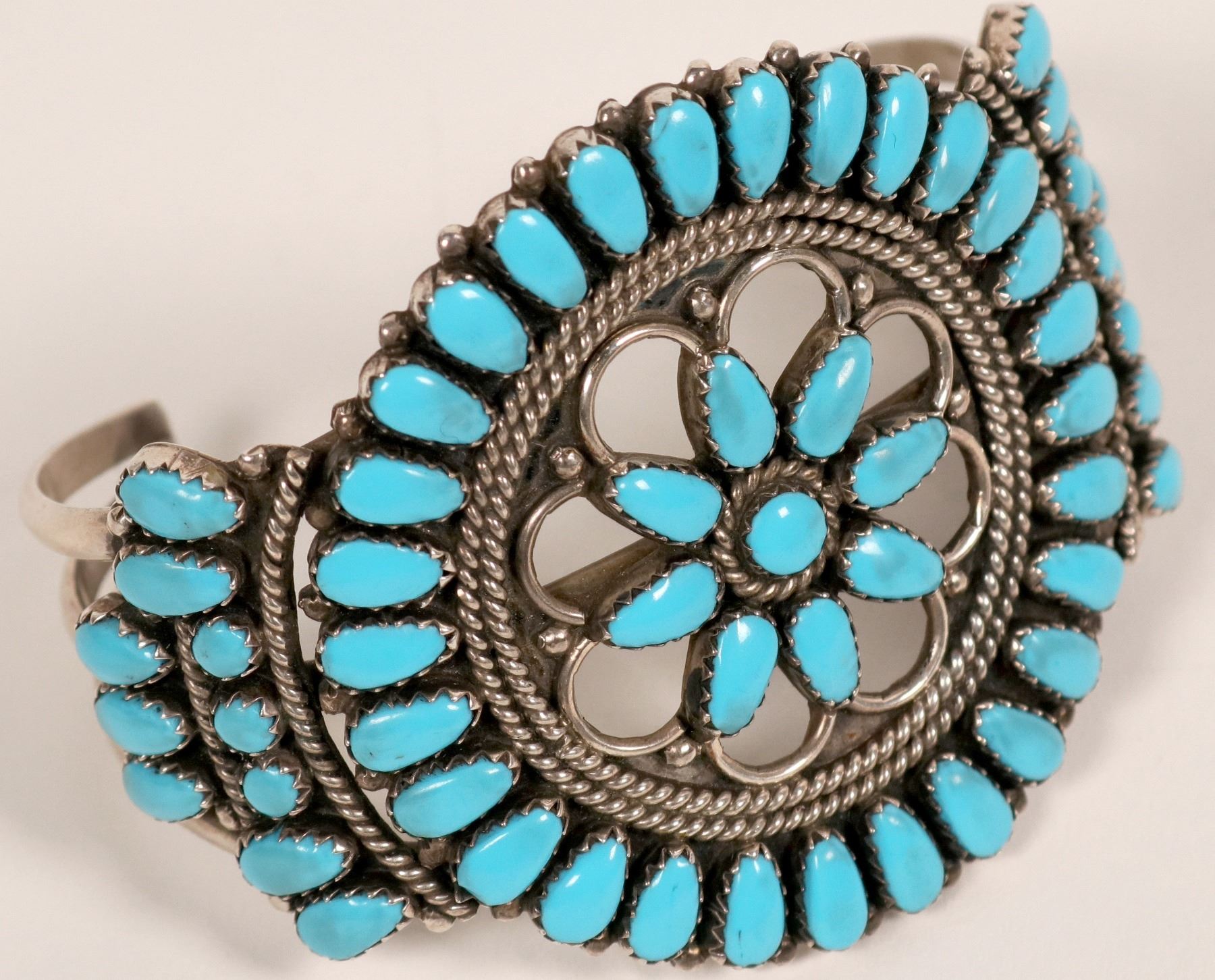 This bracelet features fifty-eight pieces of Sleeping Beauty turquoise set in petite point style in a cluster pattern, the center piece of the bracelet measures 2” in diameter, the piece is unmarked and could be of Navajo or Zuni origin.