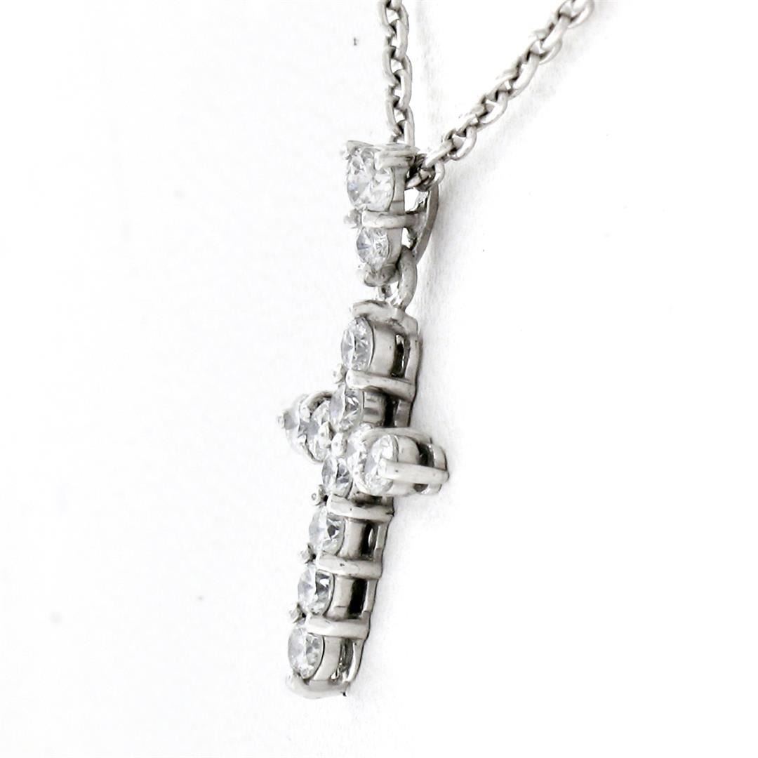 A new solid platinum cross pendant necklace, with 12 round nrilliant cut natural diamonds (F/G- VS1/VS2; 0.30ctw). The pendant weighs a total of 3.49 grams, measures 16.80x#10.10mm including the bail, and 16 inch fine cable link chain.
