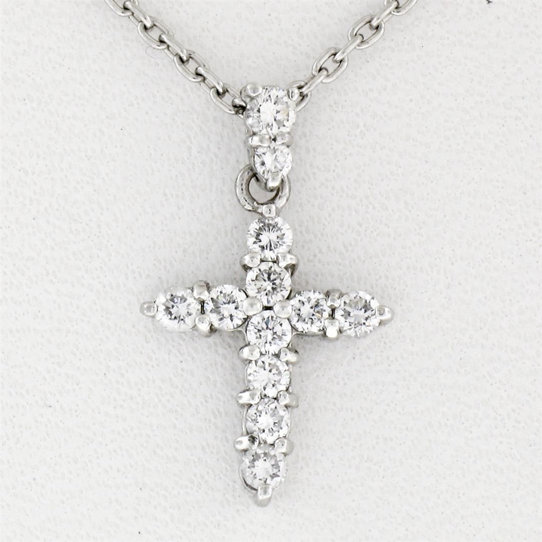 A new solid platinum cross pendant necklace, with 12 round nrilliant cut natural diamonds (F/G- VS1/VS2; 0.30ctw). The pendant weighs a total of 3.49 grams, measures 16.80x#10.10mm including the bail, and 16 inch fine cable link chain.