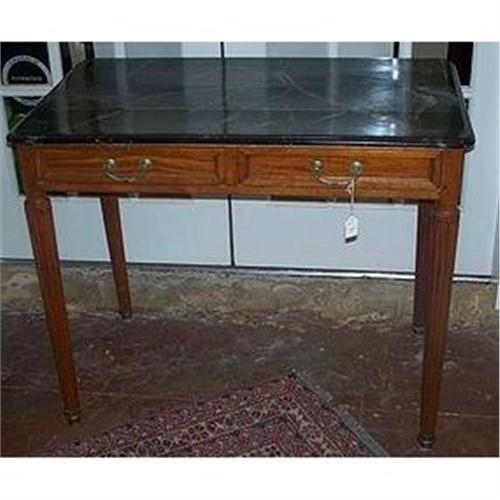 </font></strong>Offered here is a charming writing desk or table, made in Paris circa 1900- 1920. The top is hand painted faux marble with a beveled edge. The legs are reeded with brass caps. Two dovetailed drawers with original brass hardware. The interior of the right hand drawer contains the furniture maker's label. The wood may be cherry. The table measures table measures 35" by 21.5" and is 29.5" high. The condition is excellent in terms of the structure of the table. There are some losses to the faux marble paint on the top in a few places, and one of the legs in the back is slightly bowed. Altogether charming and desirable. </font>