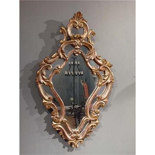 This very decorative vintage Italian mirror is carved in wood and ornamented with a silver gilt finish. The piece is made in the18th C. style, but this is a vintage example that dates to the mid 20th C. (c. 1950's). The mirror has been crafted with a marvelous aged patina, a worn and faded gilt finish that is worn to the red undercoating along some edges. It is a wonderfully decorative effect, adding to the mirrors commanding charm. The piece is in very good condition for an object of this vintage, it has expected nicks and small chip adding to its appeal. We detect an old loss at the tip of a carved details (see photos), however it small and difficult to find. The glass has a very sharp clear reflection and may be a later replacement.