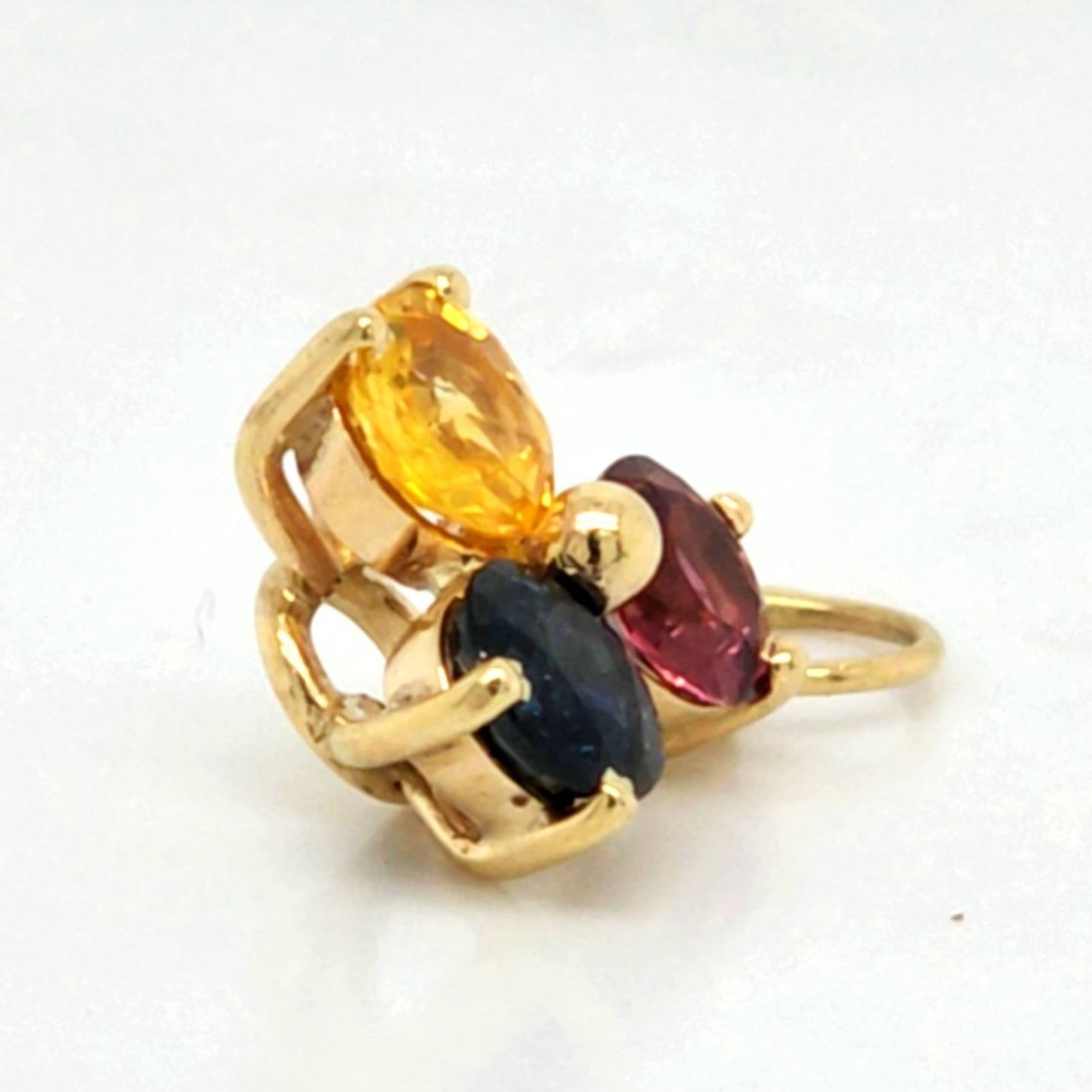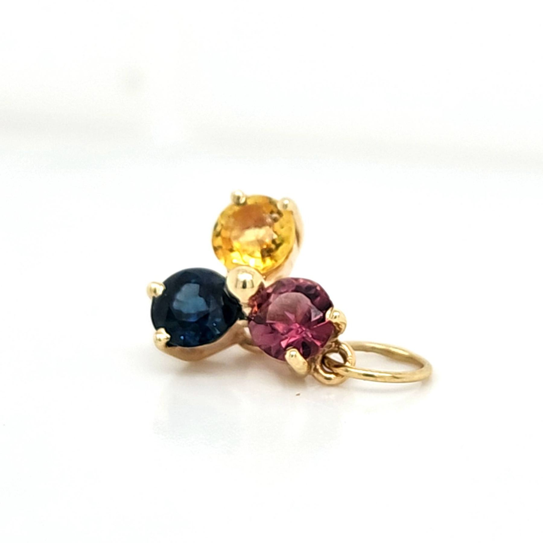 Genuine Sapphire Pendant.& nbsp; People who love sapphires know that they come in a huge variety of colors, and this petite pendant offers an attractive trio!& nbsp; This is a 14 karat (electronically tested) yellow gold custom-made pendant, utilizing the blue, pink, and yellow corundum specimens, aka sapphires!!!& nbsp; The pendant is approximately 1/2& quot; diameter and hangs from a jump ring.& nbsp; Each sapphire is approximately .50 carats, for a total of 1.50 carat total weight.& nbsp; The sapphires are prong-set and form a clover design.& nbsp; This can be worn as a pendant, charm, or even an earring adornment.& nbsp; This is a preowned, estate item in excellent condition.