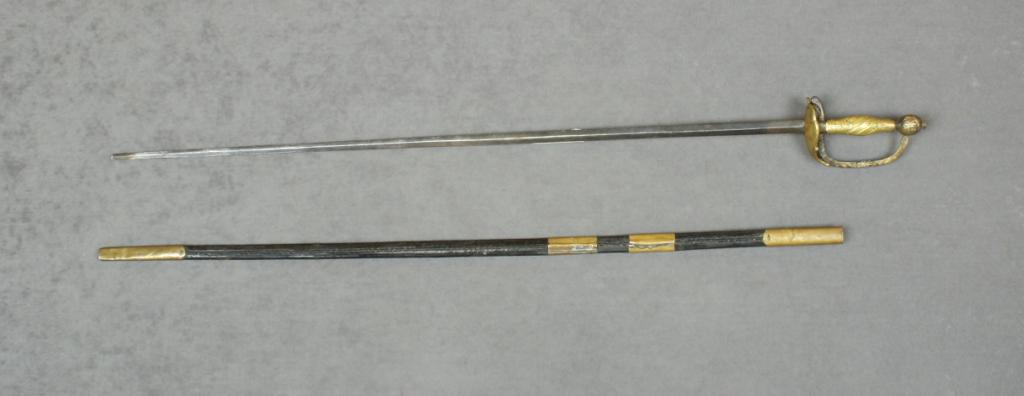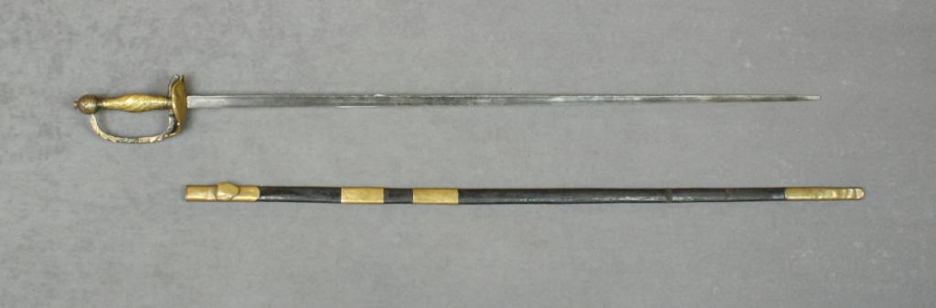 Petite court sword and sheath, approx. 38” overall and an approx. 32” plain blade, brass guard, grip and pommel in overall good condition; the sheath is also overall good with some cracking and folds to leather; even patina to brass throat, mounts and drag. Est.: $125-$250.