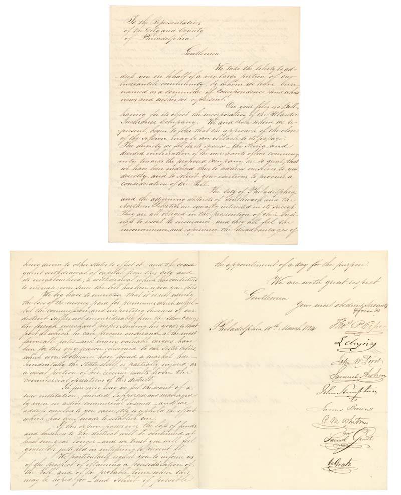 Manuscript Document. Three pages, 7 7/8” x 10”. Philadelphia. March 10, 1824. . The document reads, in part: “ … We take the liberty to address you on behalf of a very large portion of our mercantile community, by whom we have been named as a committee of correspondence and whose views and wishes we represent. On your files is a Bill, having for its object the incorporation of the Atlantic Insurance Company. We and those whom we represent begin to fear that the approach of the close of the session may be an obstacle to its passage … The City of Philadelphia and the adjoining districts of Southwark and the Northern Liberties are equally interested in its success … We beg leave to mention that it is not merely the loss of the money paid for premiums which we feel - but the commission, and importing business of our district suffers not inconsiderable from the same cause … In fine, every way we feel the want of a new institution, founded, supported and managed by men in active commercial business- and we address ourselves to you earnestly to upohold the effort which has been made to establish one … ” Usual folds. Extremely Fine. This petition did not fall upon deaf ears, and The Atlantic Insurance Company was organized in April of 1824 to deal in maritime insurance.