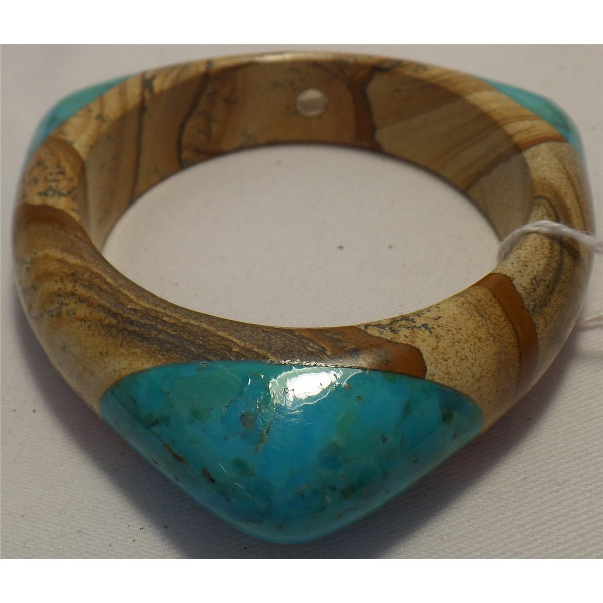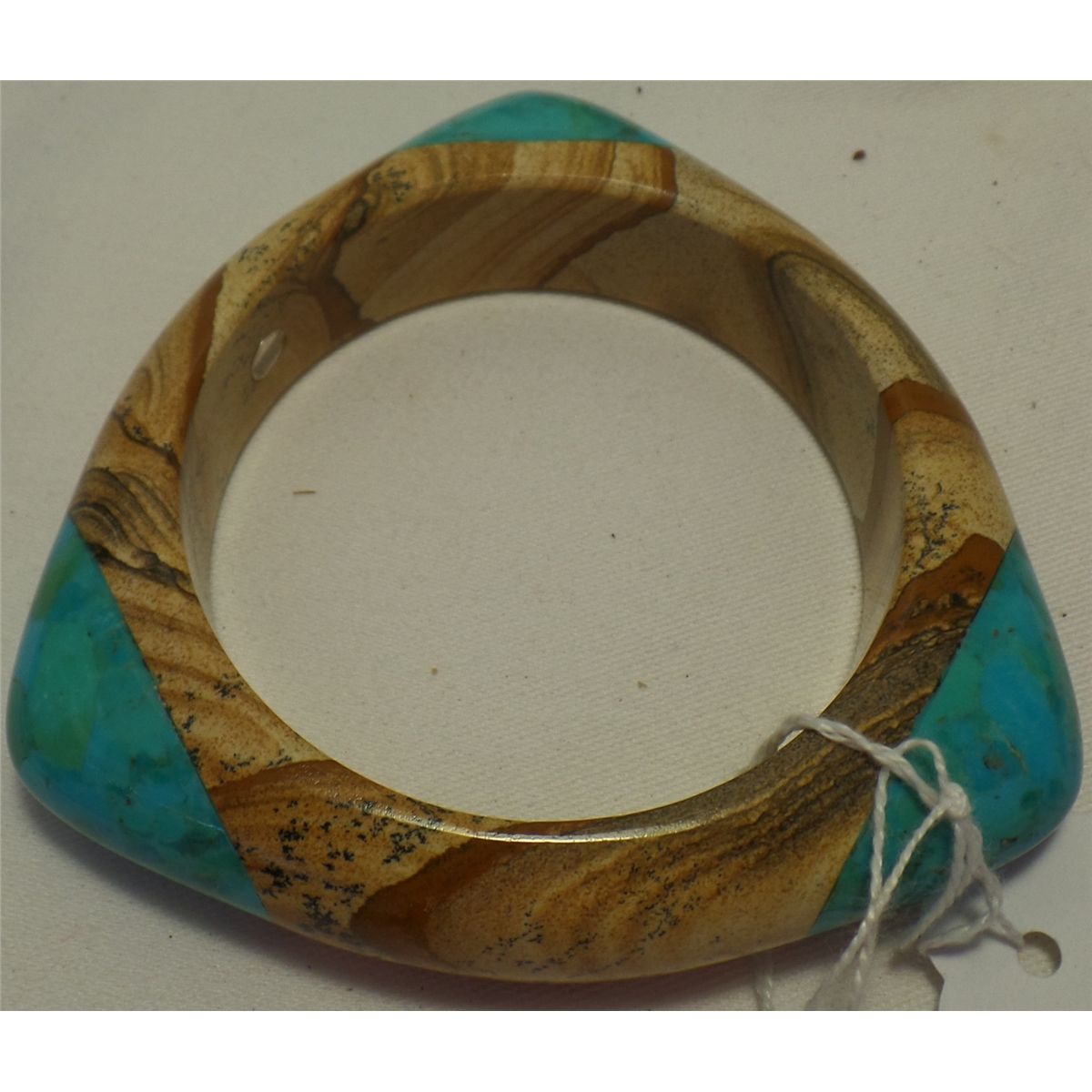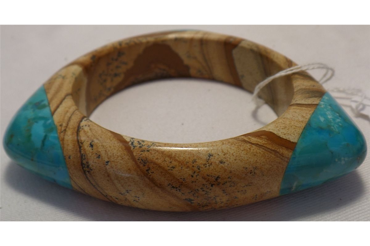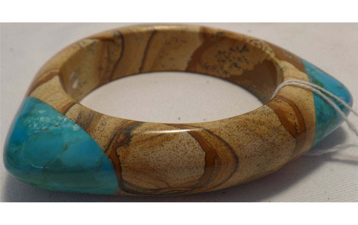 Petrified Wood & Turquoise Bracelet. Item measures approx. 9" diameter opening, whole piece 4" x .75", and weighs 140 grams. Condition: Very Good. Shipping: $14.