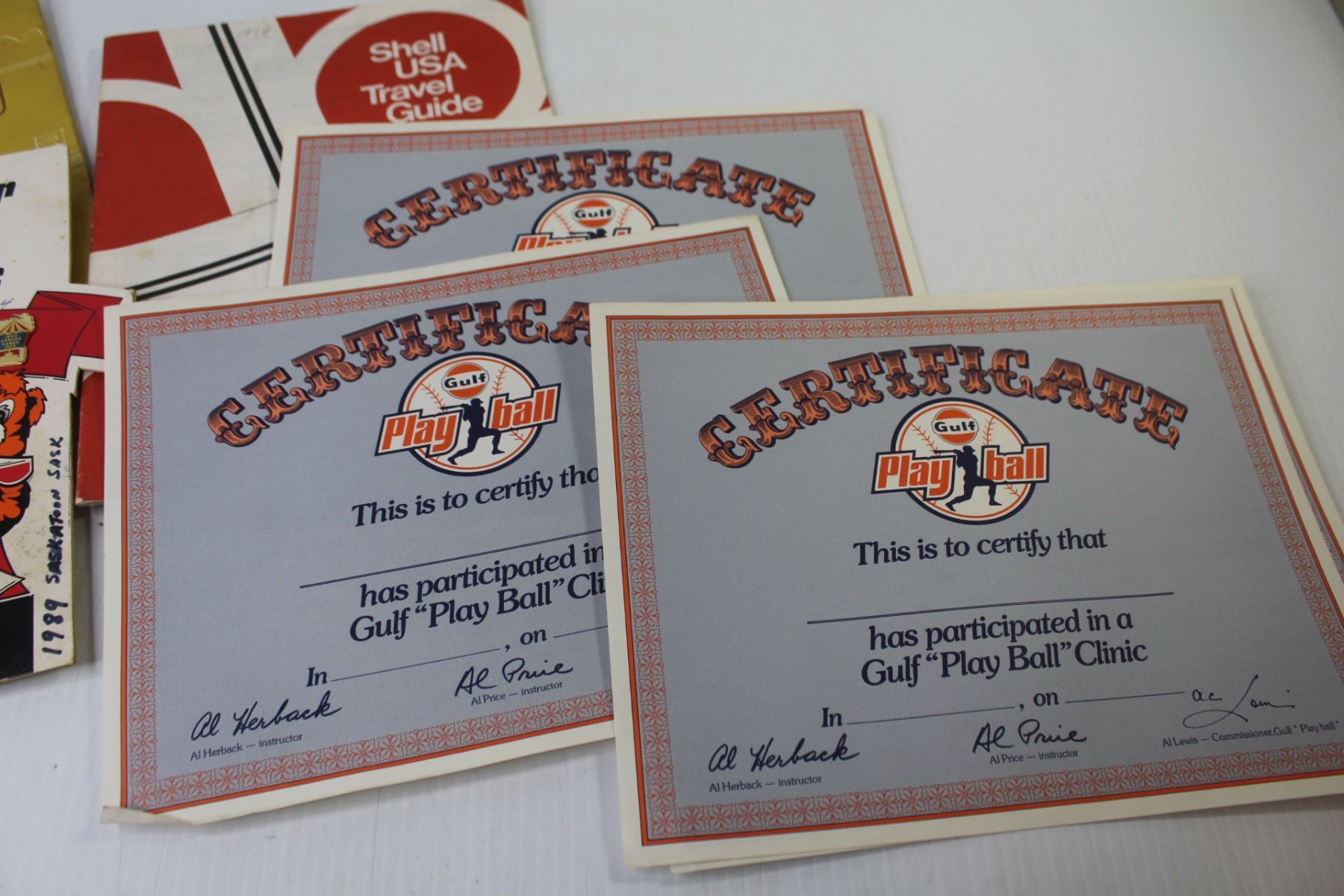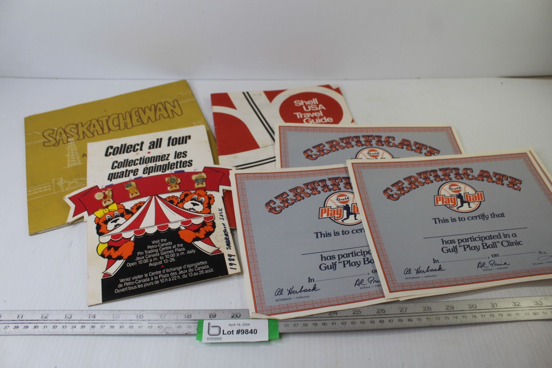 Petro Canada Collector Pins on Display Card, Air Facilities Map, Shell USA Travel Guide, Gulf "Play Ball" Certificates