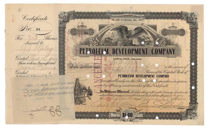1900, California. Stock certificate signed as president by EDWARD L. DOHENY (1856-1935) American oil tycoon who served as the basis for Daniel Plainview, the character portrayed by Daniel Day-Lewis in There Will Be Blood. Black / White. Vignette of an eagle perched atop a rock with a locomotive and steamships in background at top center and a vignette of an oil well at lower left. Yellow underprint. Three revenue stamps affixed at top center of recto and two affixed to verso. Blind embossed company seal. Pen and punch cancelled. Edward Doheny, the child of Irish Immigrants, first came to Los Angeles at the age of 36 in the hopes of making his fortune. Having previously worked as a gold miner, gunslinger and even a singing waiter, the impecunious Doheny luckily learned that crude oil deposits were present below what is now Douglas MacArthur Park. Together with his former mining partner, Charles Canfield, Doheny purchased a vacant lot at the edge of Los Angeles for four hundred dollars and began digging. Using only picks, shovels and eventually a makeshift drill constructed out of a Eucalyptus tree, the two men finally struck oil in late 1892 at a depth of 460 feet. Expanding the operation throughout California and Mexico in the coming years, Doheny grew to become the richest man in American by 1925, surpassing even J.D. Rockefeller. As is often the case, Doheny’s wealth allowed him to extend his influence into the political chambers of the nation’s capital, most notably as a key figure in the Teapot Dome scandal. In 1922, Doheny and Henry Sinclair secured non-competitive land leases through the efforts of Albert Fall, a longtime friend of Doheny’s who was serving in the U.S. Department of the Interior. Though these leases themselves weren’t illegal, the fact that Fall received over four hundred thousand dollars in gifts from the two oilmen for them was. Soon, The Wall Street Journal broke the news of this arrangement, paving the way for a Senate investigation and trials. During Edward Doheny’s trial for bribery, personal tragedy struck the Doheny family when, on February 16, 1929, Ned Doheny and his personal secretary were shot and killed at Ned’s spectacular Greystone mansion. While the circumstance surrounding this tragic event remains clouded in mystery and intrigue, the loss may have played on the sympathies of the jurors, who only needed and hour to return with a not guilty verdict. Conversely, the other to key figures in the case, Henry Sinclair and Albert Fall, the latter of whom earned the dubious distinction of being the first cabinet member to service a prison sentence, were both convicted. The Petroleum Development Company was the first company to interest the railroads on the Pacific coast in the use of oil as a fuel source for their locomotives. In 1903, the AT & SF purchased the company and its properties.