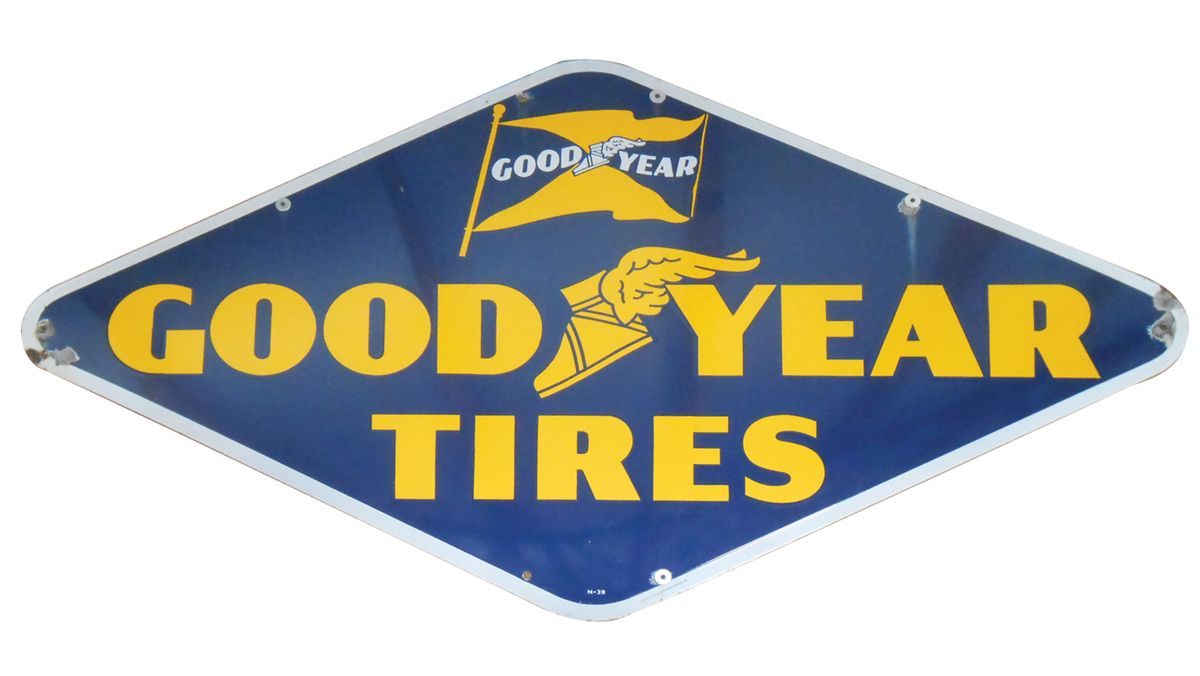 Petroliana, Goodyear Tires porcelain sign, diamond shape, dated 1939, VG cond w/some loss on 2 corners, 40"H x 72"W.