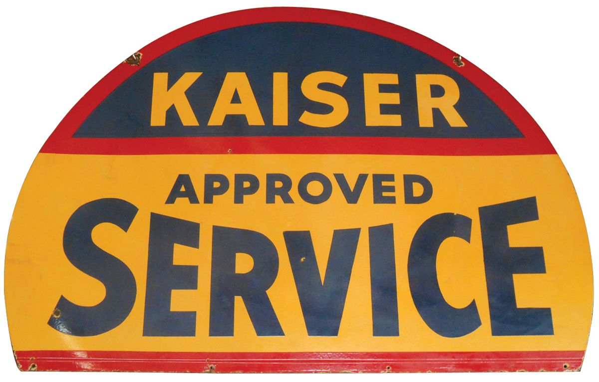 Petroliana, Kaiser Approved Service, 2-sided porcelain half-circle sign, Exc cond both sides w/minor chips, 42"H x 59"W.