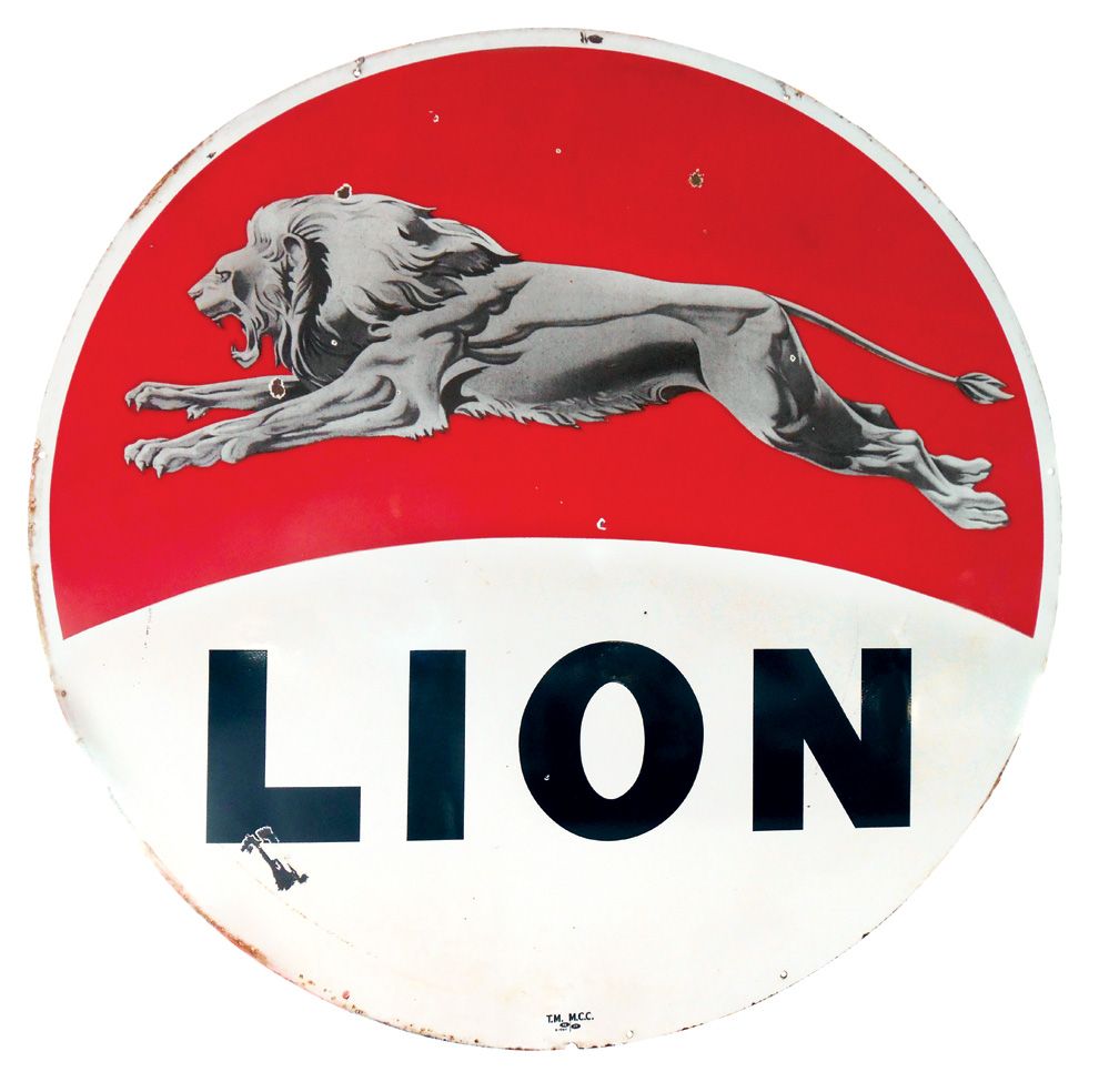 Petroliana, Lion Gasoline porcelain sign, c.1960, great graphics, VG to Exc cond w/minor chips, 72"Dia.
