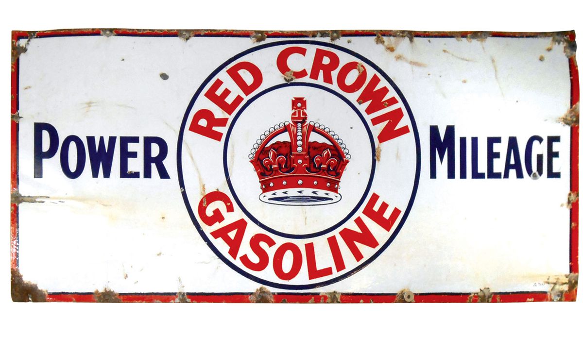 Petroliana, Red Crown Gasoline Power Mileage porcelain rectangular sign w/Red Crown graphic, Good cond, 28"H x 60"W.