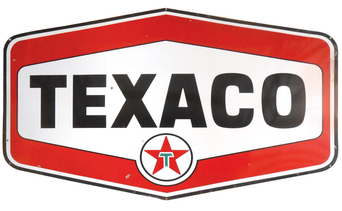 Petroliana, Texaco porcelain sign, 2-sided w/T in star logo, a nice large sign in VG/Exc cond w/minor chips, 54"H x 85"W.
