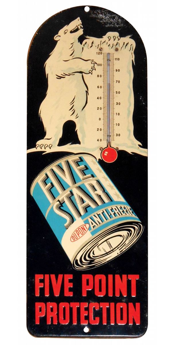 Petroliana, thermometer, Five Star Anti-Freeze Five Point Protection, made by American Can Co., embossed metal, great polar bear graphics, VG+ cond w/minor paint loss at top, 21"H x 7.5"W.