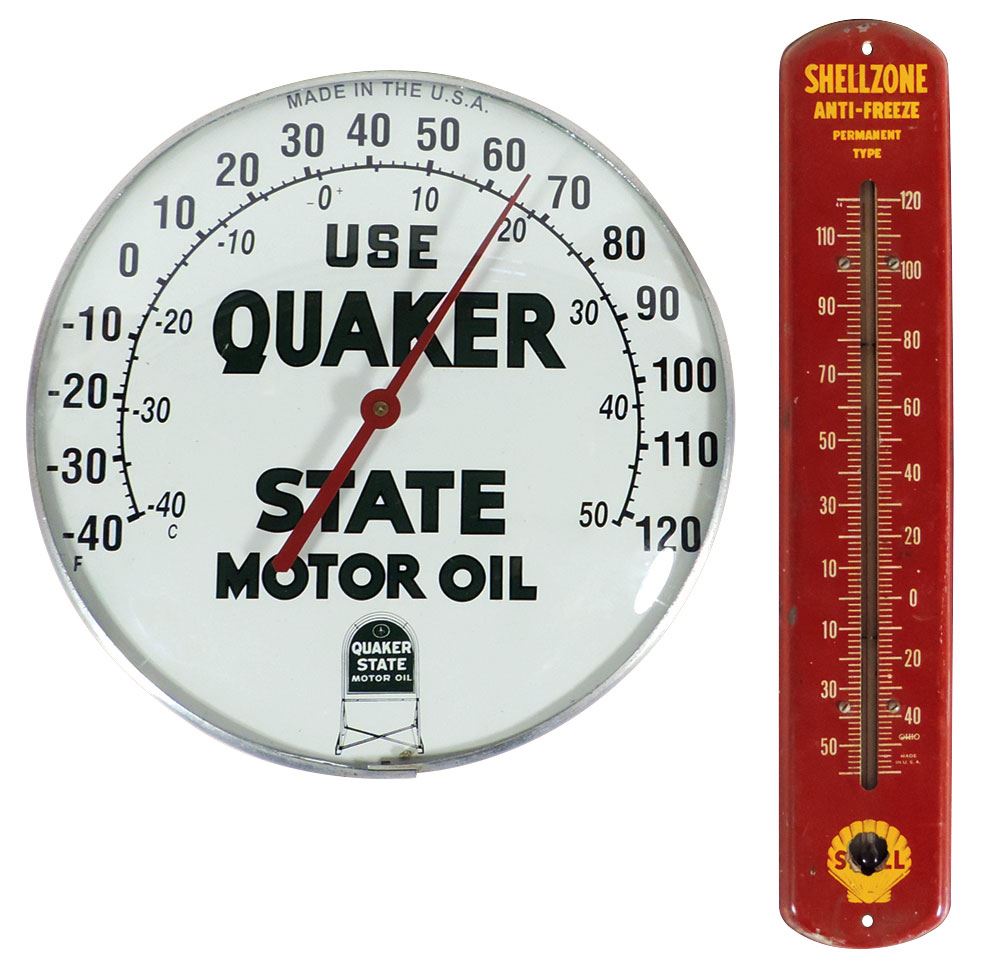 Petroliana, thermometers (2), Shell Shellzone Anti-freeze, metal & Quaker State Motor Oil, Shell VG+