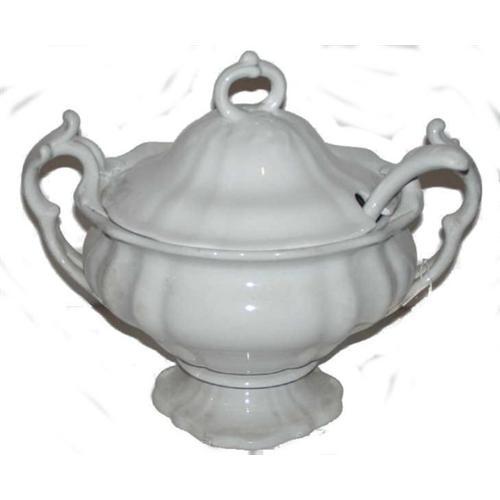 This Petrus Regoui & Co white faience tureen with original lid and ladle comes from Maastricht Belgium. Measures 15" by 12" by 10.5" and weighs an estimated 5-8 lbs. Condition is excellent with no chips, cracks or restorations. There is some label residue in spots and it could use a thorough cleaning.