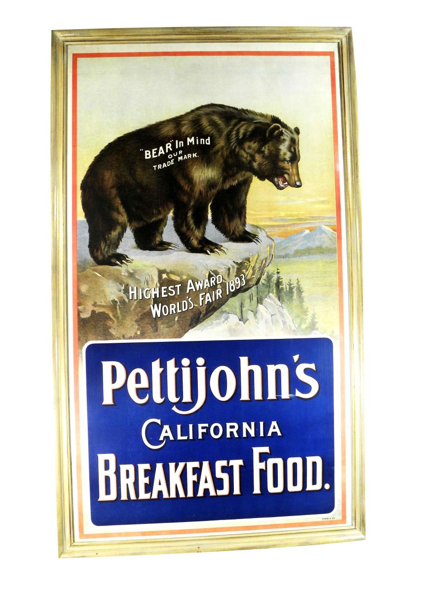 Pettijohn's California Breakfast Food Paper Sign. "Bear in Mind or Trademark". Highest award World's Far 1893.The only one known. Forbes Co. Lithographer. Tear at 1:00, small piece of paper missing at 2:00, light stain on border at 8:00 otherwise excellent condition, framed under glass. 29 X 52 inches image only.