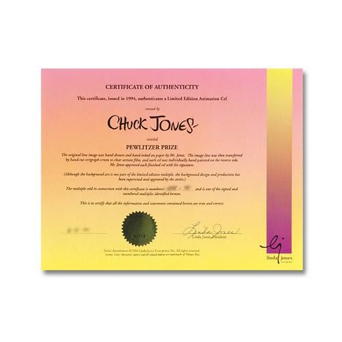 Own this amazing piece based on the original line image hand drawn and hand-inked on paper by Mr. Jones! "Pewlitzer Prize" is a sold out limited edition animation cel with hand painted coloring on sericel outline, numbered and hand signed by Chuck Jones (1912-2002). Includes Certificate of Authenticity! Measures Approx: 10.5" x 12.5".