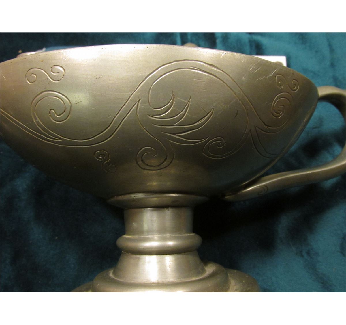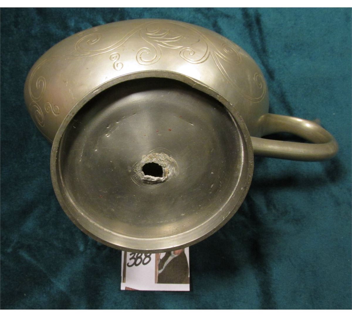 Pewter "Alladin's Lamp" Style Candle holder with candle. Hole in base. 'Doc' valued it at $150.00.